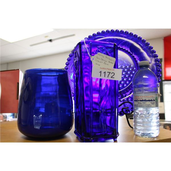 Sarsaparilla Deco Designs Vase, Cobalt Blue Pressed Fruit Glass Platter Hobnail Edge, IKEA Blue Vase