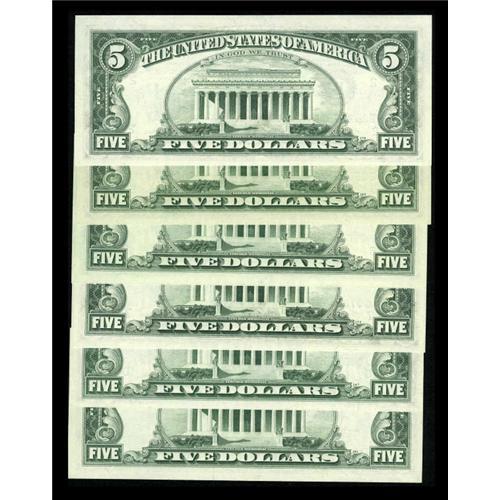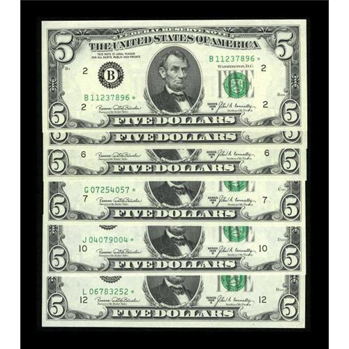 <B>Complete District Set Fr. 1971-B*-L* $5 1969B Federal Reserve Star Notes. Gem Crisp Uncirculated.</B></I><BR> Only six districts issued replacement notes for this short-lived series and they are all included in this lot. Solid embossing is seen on these pack fresh gems.<BR><I>From The Thomas M. Flynn Collection</B></I><BR><BR><b>Shipping:</b> Coins & Currency (<a target="_blank" href="http://www.heritageauctions.com/common/shipping.php">view shipping information</a>)