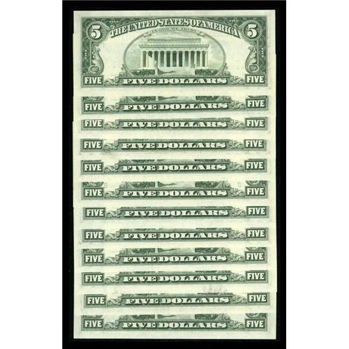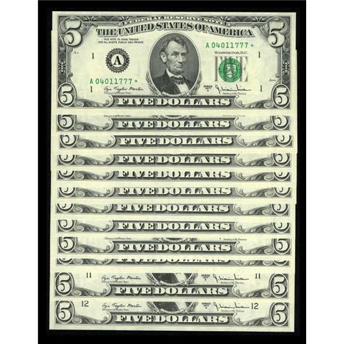 <B>Complete District Set Fr. 1975-A*-L* $5 1977A Federal Reserve Star Notes. Choice Crisp Uncirculated or Better.</B></I><BR> This lot contains a district set of the twelve replacement notes issued for this series. Only the centering on a couple of notes holds these pack fresh beauties back from gem status.<BR><I>From The Thomas M. Flynn Collection</B></I><BR><BR><b>Shipping:</b> Coins & Currency (<a target="_blank" href="http://www.heritageauctions.com/common/shipping.php">view shipping information</a>)