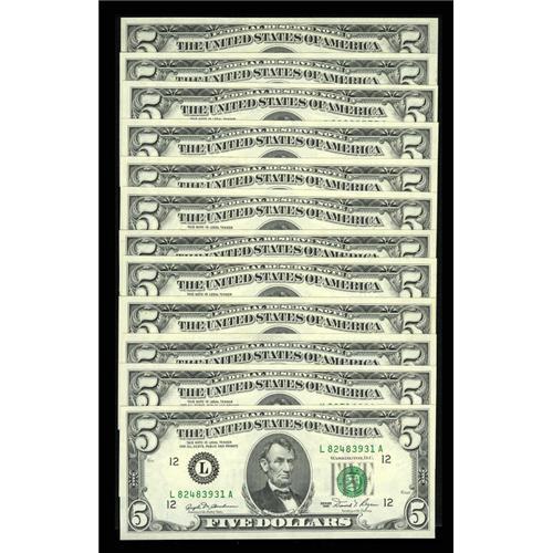 <B>Complete District Set Fr. 1976-A-L $5 1981 Federal Reserve Notes. Choice Crisp Uncirculated or Better.</B></I><BR> This is a wonderful complete district set of notes from this more challenging series which has a Schwartz-Lindquist book value of about $375.<BR><I>From The Thomas M. Flynn Collection</B></I><BR><BR><b>Shipping:</b> Coins & Currency (<a target="_blank" href="http://www.heritageauctions.com/common/shipping.php">view shipping information</a>)