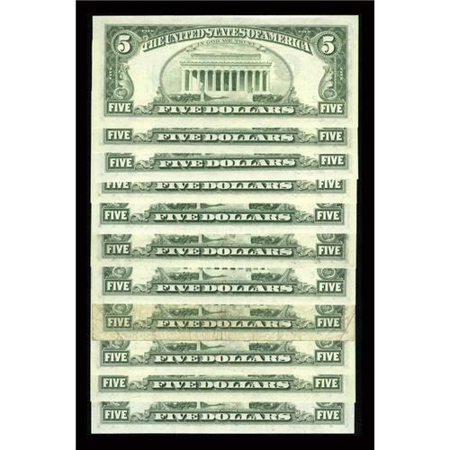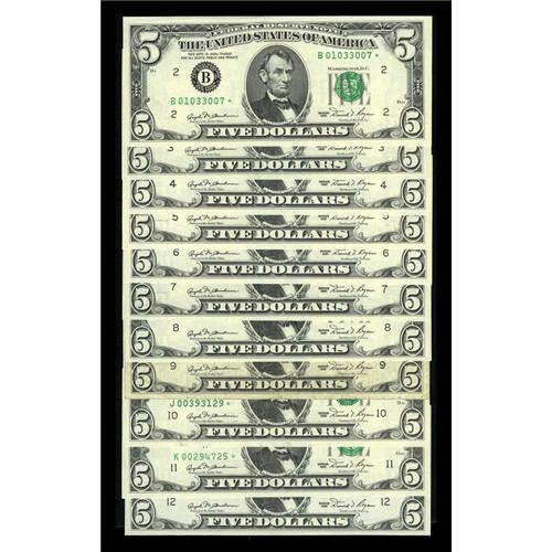 <B>Complete District Set Fr. 1976-B*-L* $5 1981 Federal Reserve Star Notes. Very Good-Fine.</B></I><BR> All but the Boston district issued replacement notes for this series and they are all represented in this lot. While the scarce Minneapolis star is heavily circulated, the other ten pieces are pack fresh and grade at least <B>Choice Crisp Uncirculated</B></I>.<BR><I>From The Thomas M. Flynn Collection</B></I><BR><BR><b>Shipping:</b> Coins & Currency (<a target="_blank" href="http://www.heritageauctions.com/common/shipping.php">view shipping information</a>)
