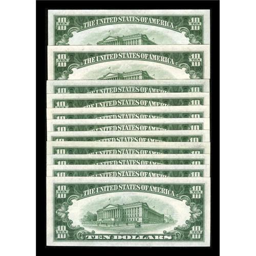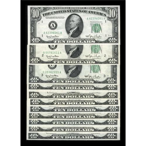 <B>Nearly Complete District Set Fr. 2010-A-L $10 1950 Wide Federal Reserve Notes. Choice Crisp Uncirculated or Better.</B></I><BR> Missing only the Kansas City district, this is a nearly complete set of the Wide variety for this series. These eleven original notes all show embossing and natural paper wave.<BR><I>From The Thomas M. Flynn Collection</B></I><BR><BR><b>Shipping:</b> Coins & Currency (<a target="_blank" href="http://www.heritageauctions.com/common/shipping.php">view shipping information</a>)