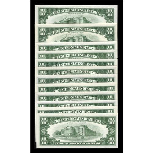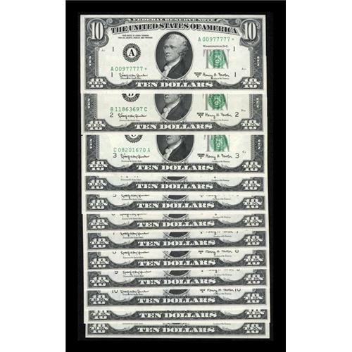 <B>Complete District Set Fr. 2017-A-L $10 1963A Federal Reserve Notes. Choice Crisp Uncirculated or Better.</B></I><BR> While all twelve districts are represented in this set for this series, it is made up of an assortment of regular and replacement notes. Star notes account for five of the districts with regular notes for the other seven. Nice embossing is seen on these original examples.<BR><I>From The Thomas M. Flynn Collection</B></I><BR><BR><b>Shipping:</b> Coins & Currency (<a target="_blank" href="http://www.heritageauctions.com/common/shipping.php">view shipping information</a>)