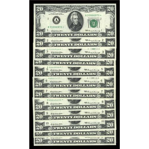 <B>Complete District Star Set. Fr. 2067-A*-L* $20 1969 Federal Reserve Notes. Choice Crisp Uncirculated or Better.</B></I><BR> These stars are nicely preserved save for the A* which grades <B>AU.</B></I><BR><I>From The Thomas M. Flynn Collection</B></I><BR><BR><b>Shipping:</b> Coins & Currency (<a target="_blank" href="http://www.heritageauctions.com/common/shipping.php">view shipping information</a>)