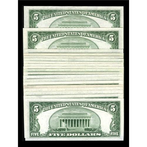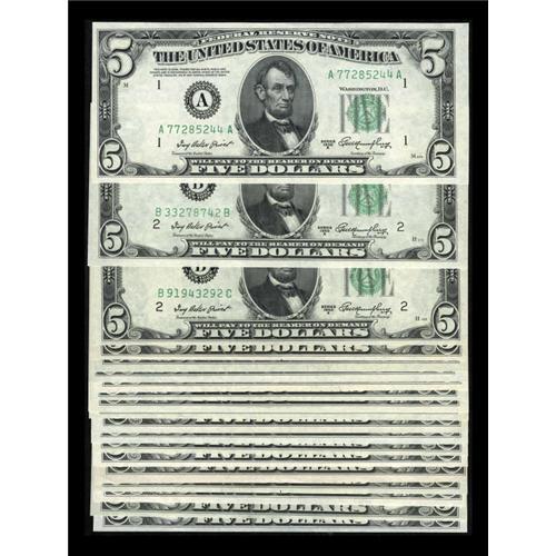<B>Complete District and Block Set Fr. 1962-A-L $5 1950A Federal Reserve Notes. Crisp Uncirculated or Better.</B></I><BR> Not only are all twelve districts represented in this set, but also the blocks from the six districts that made it to a second (or third) block are included. While a note or two has a tight margin, most of examples are at least choice or better. This is an opportunity to pick up a complete block set for this series with one easy bid.<BR><I>From The Thomas M. Flynn Collection</B></I><BR><BR><b>Shipping:</b> Coins & Currency (<a target="_blank" href="http://www.heritageauctions.com/common/shipping.php">view shipping information</a>)
