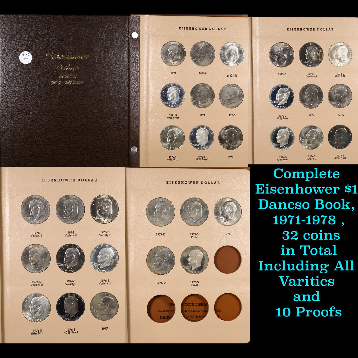 Complete Eisenhower $1 Dancso Book, 1971-1978 Proof, 32 coins in Total Including All Varities and 10 Proofs. All coins encased in a Nice Dansco Book. Date Range from 1971-198. A fantastic grouping of 32 coins. 5 Stunning Rainbow Toned WOW! Fantastic PQ SET! A Corey's Pick, Bid to Win Coin