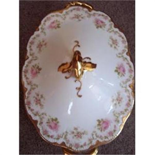 </font></strong>This is a complete dinner set from Theodore Haviland. It consists of 10 dinner plates (10"), 10 salad / dessert plates (8.5"), 7 salad / dessert plates (7.5"), 12 berry bowls (5"), 8 bread plates (6"), 12 butter pats (3"), 11 tea cups, 10 tea saucers, 1 serving platter (12"), 1 serving platter (14"), 1 serving platter (18"), 1 relish tray (8.5"), 1 oval covered serving bowl (11.5"), 1 round covered serving bowl (10.5"), 1 oval open serving bowl (9"), 1 oval open serving bowl (10"), 1 round scalloped salad bowl (10"), 1 round covered butter dish with insert, and one footed gravy boat with attached underplate. <p>It is decorated with delicate pink roses and garlands, and LOTS of gold. All pieces are in impeccable condition, there is no damage of any kind, and most of the pieces appear never to have been used. The gold appears to be 100% intact. There are no chips, cracks, dings, flea bites, hairlines, or any other types of damage on any of the pieces.<p>I have not been able to identify the pattern; it may be one that was never classified or numbered. However, it is possible to sometimes find pieces of this pattern on the internet, in case anyone wants to add to the set. The mark dates this set back to 1936 or earlier.<p>Entire sets of Haviland are hard to find today; it is especially difficult to find one in such a pretty pattern and such good condition. This is an heirloom-quality set that will make a stunning gift for the discerning collector.</font>