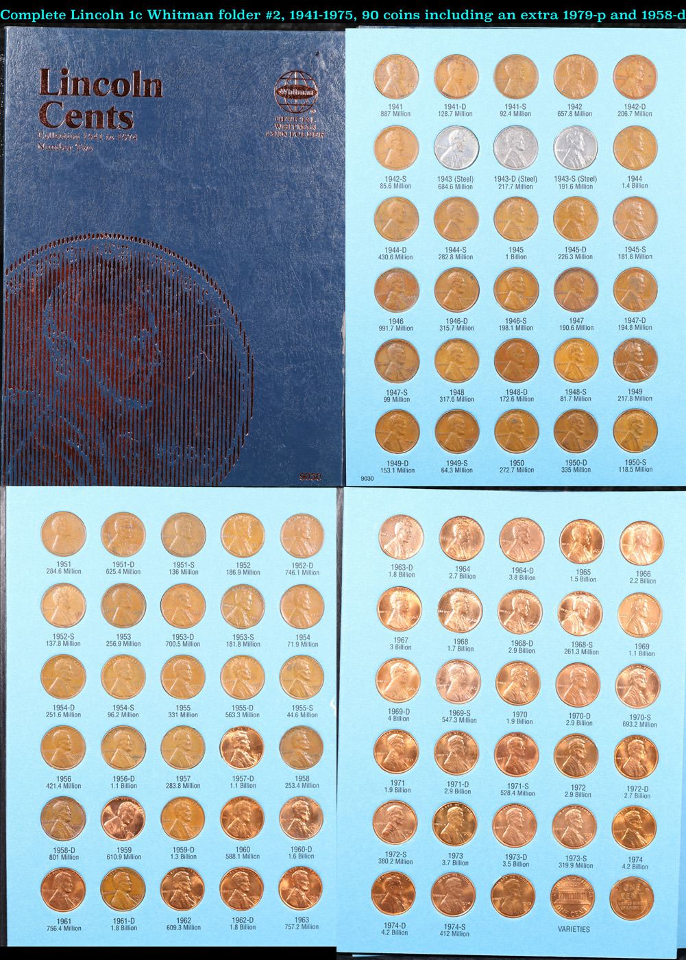Complete Lincoln 1c Whitman folder #2, 1941-1975, 90 coins including an extra 1979-p and 1958-d.. All coins encased in a Whitman Lincoln Cent 1941-1974 book #2. Date Range from 1941-1975, many coins after 1957 have a lot of luster A fantastic grouping of 90 coins.