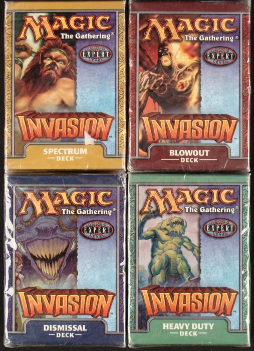 Attention all you Magic the Gathering fans, this a lot that should not be passed up on. Offered here is the complete set of Magic the Gathering: Invasion Decks. In this lot you will receive:Invasion- BlowoutInvasion- DismissalInvasion- Heavy DutyInvasion- SpectrumAll of the decks have never be opened and are in their original package.Invasion sports a lot of new features never seen before. Some new cards now have a kicker, an optional casting cost that can boost the effect of a card later in the game, at the cost of a slightly less effective cost early in the game. In addition, the new set also introduces the split card, a card with two mini cards printed on each card. Each half is less effective then a comparable spell would be, but the added flexibility of having two choices of which card to take can more than make up for the deficiency.