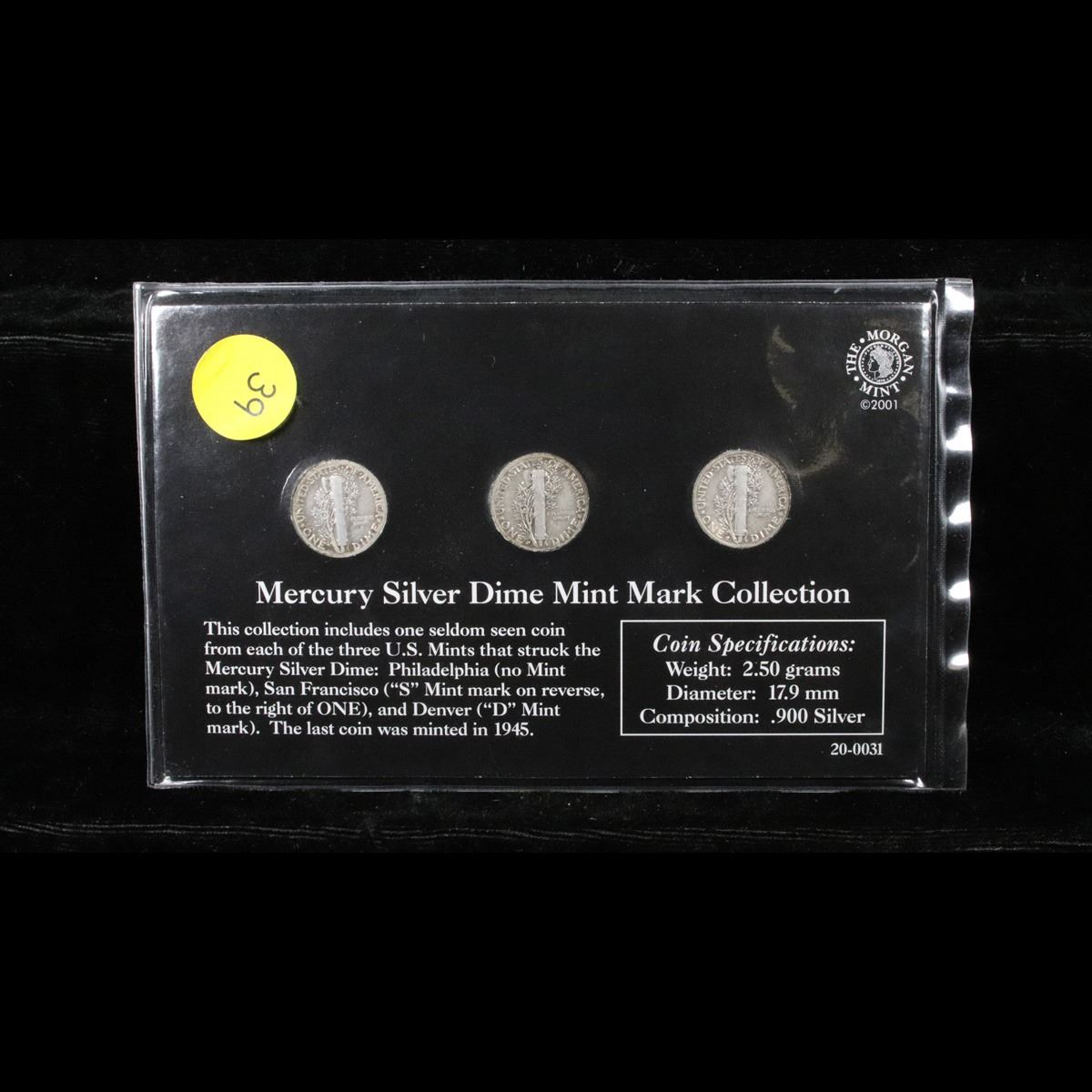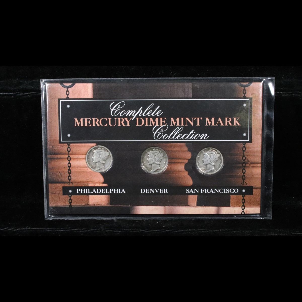 Complete Mercury Dime Mint Mark Reaction . .. This collection includes one seldom seen coin from each of the three U.S. Mints that struck the Mercury Silver Dime: Philadelphia (No Mint Mark), San Fransisco ("S" Mint Mark On Reverse to the right of ONE) and Denver ("D" Mint Mark). The last coin was minted in 1945.