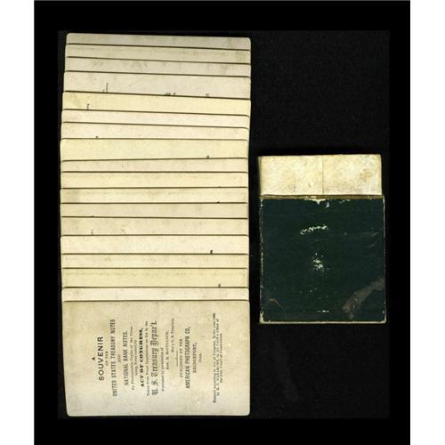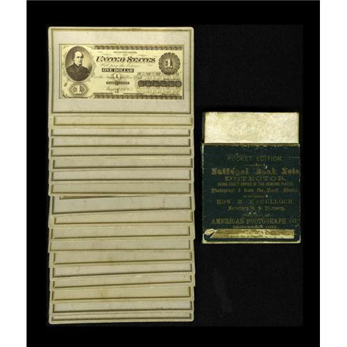 <B>Complete Naramore Counterfeit Detector Set with partial box.</B></I> A beautiful condition set with all 18 notes present. These are actual photographic copies authorized by the Treasury Department in 1866. The photos are of Proof notes without the seals or signatures, but with the complete engraving. All nine denominations of Legals, from the $1 to the $1,000 are present, as are the same nine denominations of Original Series National Bank Notes. This set is also ensconced in a partial Naramore Pocket Edition dark green box. The outer slip case for the box is missing, but the cards have been well preserved. Original Naramore boxes are most difficult to come by, making even this partial box a true wonder of survival. Perhaps the best set of Naramore cards that we have ever seen with their reflective gold trim and clean surfaces.