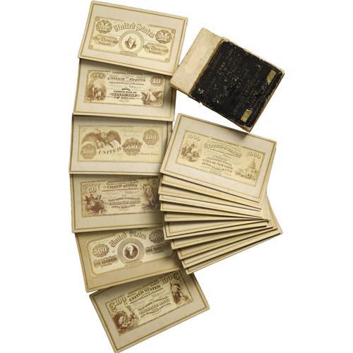 <B>Complete Naramore Counterfeit Detector Set with Partial Box.</B></I><BR> This is a beautiful condition set with all 18 notes present. These are actual photographic copies authorized by the Treasury Department in 1866. The photos are of Proof notes without the seals or signatures, but with the complete engraving. All nine denominations of Legals, from the $1 to the $1000 are present, as are the same nine denominations of Original Series National Bank Notes. This set is also ensconced in a partial Naramore Pocket Edition box. The outer slip case for the box is missing, but the cards have been well preserved. Original Naramore boxes are most difficult to come by, making even this partial box a true wonder of survival. This is one of the best set of Naramore cards that we have ever seen with their reflective gold trim and clean surfaces. We sold a similar set in September 2006 for almost $2000.<BR><BR><b>Shipping:</b> Coins & Currency (<a target="_blank" href="http://www.heritageauctions.com/common/shipping.php">view shipping information</a>)