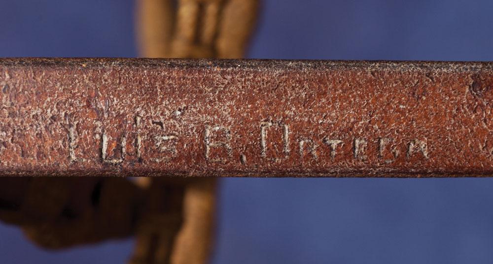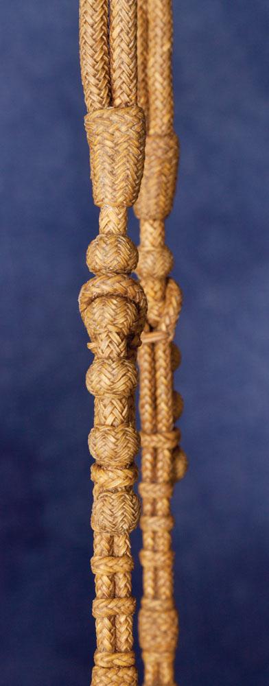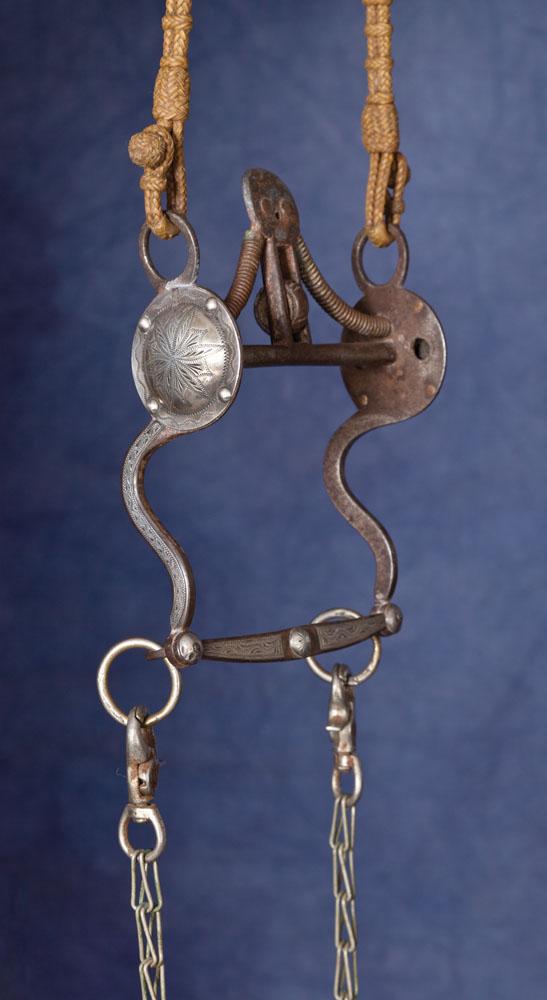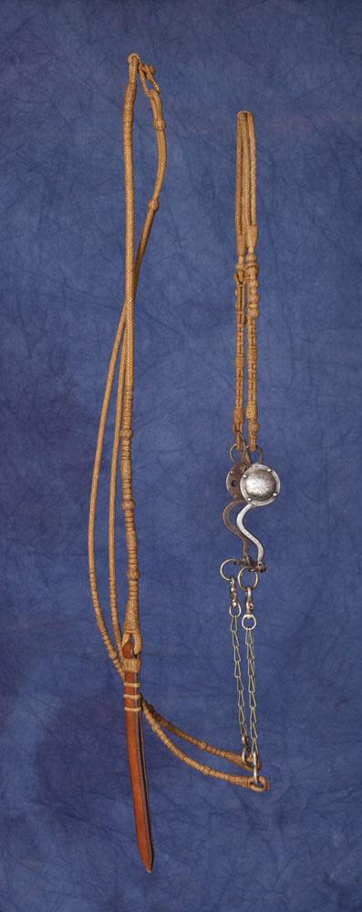 Rawhide headstall constructed of double-8 plait, whipped, gaucho and herringbone knots. Matching closed reins with romal and Ortega maker-marked leather popper. Includes S-shank silver overlaid California spade bit. Everything in fine condition, c. 1960s.