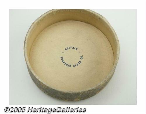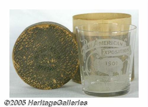 <B>Complete Pan-Am Expo Glass in Original Box</B></I> We've never seen this available in the original as-sold container. The Pan American Exposition was held in 1901 in Buffalo, New York and used the buffalo, pictured here on the front of this glass, as part of their logo. The cylinder holding the glass is original to the piece, but the bottom of the holder has come unglued due to aging. The glass representative of the exposition is in excellent condition with no chips or problems. Unusual to find this piece complete. Lot:254