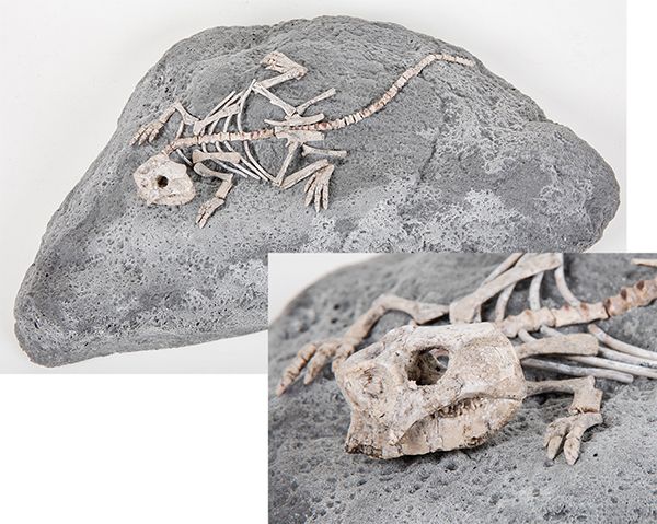 Complete Psittacosaurus Dinosaur. Psittacosaurus is a very important dinosaur that lived between 120-130 million years ago in Liaoning Province, Central Asia. Psittacosaurus is important as being the oldest ancestor of the famous horned dinosaurs such as Triceratops. Psittacosaurus did not have horns but did possess a horned beak and bony Jugals (back of the upper jaw) which are characteristic of only ceroptopsian (horned) dinosaurs. Psittacosaurus is the most studied of all dinosaurs because it is known from all stages from hatchling to adult. With eggs about 3 inches long, the hatchlings were about 6 inches long. Even though Psittacosaur nests contained no more than 24 eggs, an adult Psittacosaur over 4 feet long was found fossilized with more than 65 juvenile Psittacosaurs none larger than 19 inches long suggesting that baby Psittacosaurs were kept in their nesting area as they grew from 6 inches to as much as 19 inches in length and were protected and probably fed by adult Psittacosaurs. This 11 inch long baby Psittacosaur is the smallest mounted dinosaur ever offered at auction and consists of at least 85% real bone, missing only the small delicate neural spines along the back and tail and the rib bones which were reconstructed. The great preservation of the small delicate bones occurred because this dinosaur was instantly buried under volcanic ash over 120 million years ago, a sort of dinosaurean Pompei. The all important 3-D skull is 1.5 inches long with no distortion and all of the matrix completely removed from inside the skull and with some real teeth on both the upper and lower jaws. This small complete dinosaur has been repositioned in a natural looking display of the bones atop a 15 x 9 inch faux rock and would make an excellent desk or even wall display.