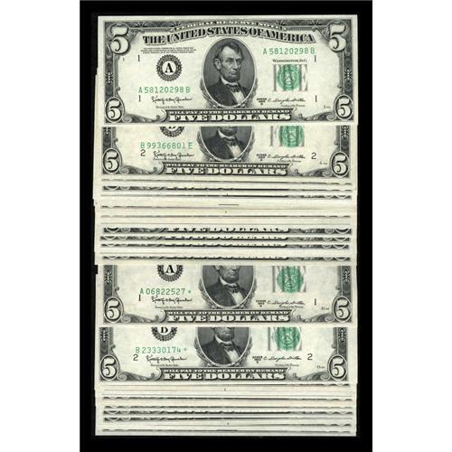 <B>Complete Regular and Star District Set $5 1950D Federal Reserve Notes. Choice Crisp Uncirculated or Better.</B></I><BR> All sixteen regular blocks used for this series along with a replacement note for each district are included in this lot. Natural paper wave and embossing are abundant on all 28 notes in this all-encompassing group for this series.<BR><I>From The Thomas M. Flynn Collection</B></I><BR><BR><b>Shipping:</b> Coins & Currency (<a target="_blank" href="http://www.heritageauctions.com/common/shipping.php">view shipping information</a>)