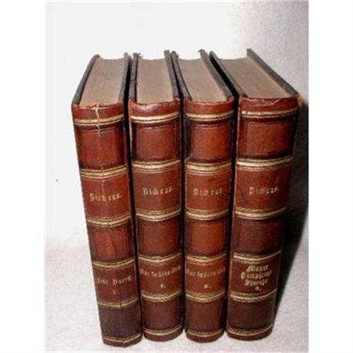 Complete set of four Charles Dickens with deep brown leather spine novels C.19th century are written in Swedish in old English printing. Black pebbled grain front and back covers. Gold tooling on the spine for names and lining. The set includes "Lille Dorrit,1862,"Mafler humphreyes Stenhr" Vor faelleds Den 1864. In excellent condion with exception to one cracked spine which is intact not separated or loose3. Measure 6 7/8 H X 5.50L X 1 1/8 D. Beautiful as accent books on bookcase or elsewhere or for reading if can read Swedish.