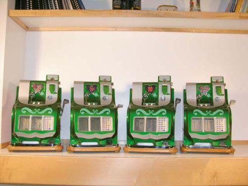Complete set Mills Q.T. Sweetheart slot machines. 1 cent, 5 cent, 10 cent, 25 cent. Circa 1934, all cast iron. Professionally restored. Maybe the only complete set of all 4 denominations. Rare.