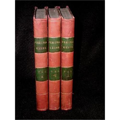 Complete set C.1842 English novels "Percival Keene" in a three part series,leather bound in deep wine spine with green inserts and gilt lettering with leather half cover and corners. Gilt top pages.Peacock marbilized cover front and back. The trio is by Capt Marryat,author of "Peter Simple" and "Jacob Faithful". Each measure 7.5H X 5W X 1D. Excellent condition.
