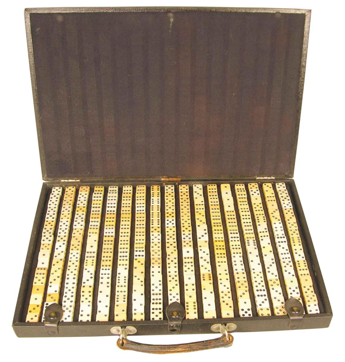 Complete Set of 144 pair of cheating dice, in carrying case. Unmarked but believed to have come from E. C. Evans Co. Excellent condition. Case measures 16 1/2 X 11 X 1 1/4 inches.