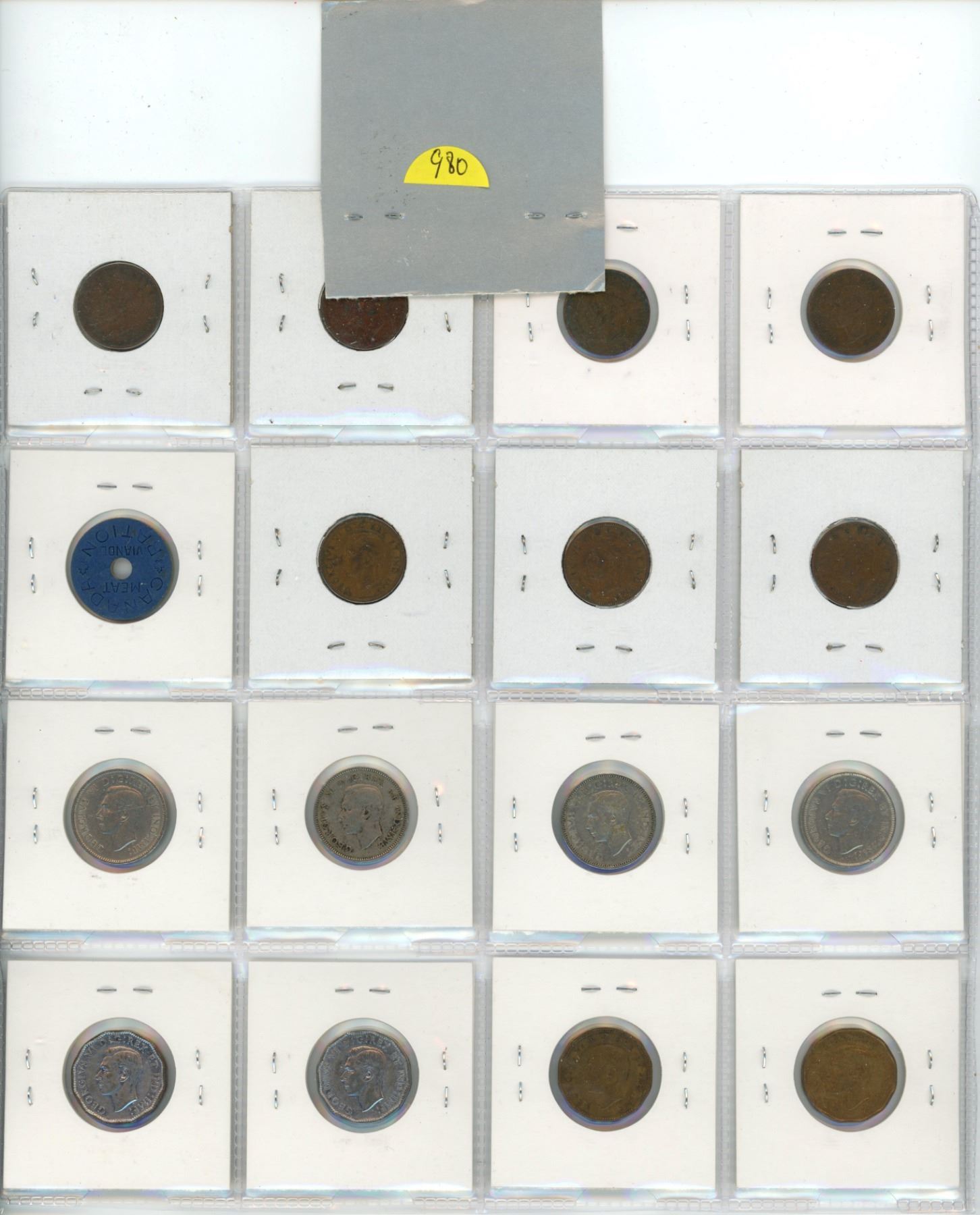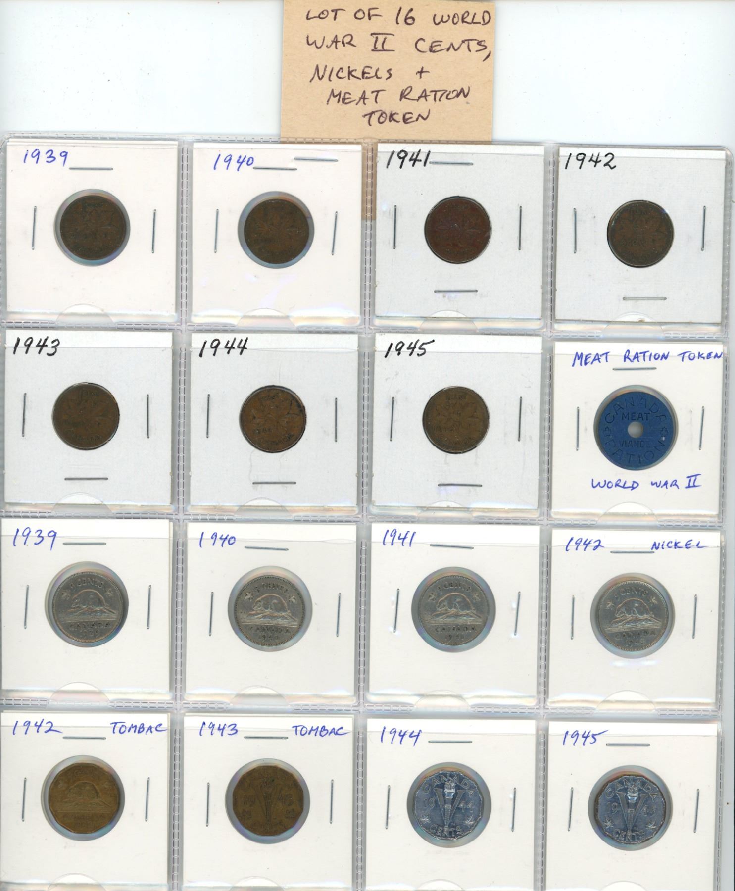 Complete Set of 16 Canadian World War II coins. All cents and all nickels including both Tombacs and one Meat Ration Token. A nice set.