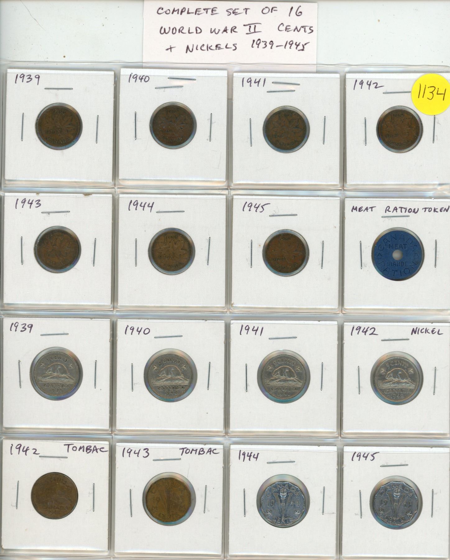 Complete Set of 16 World War II Cents & Nickels 1939 – 1945. Includes both Tombacs plus one Meat Ration Token. A nice selection.