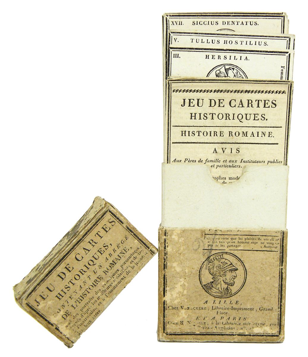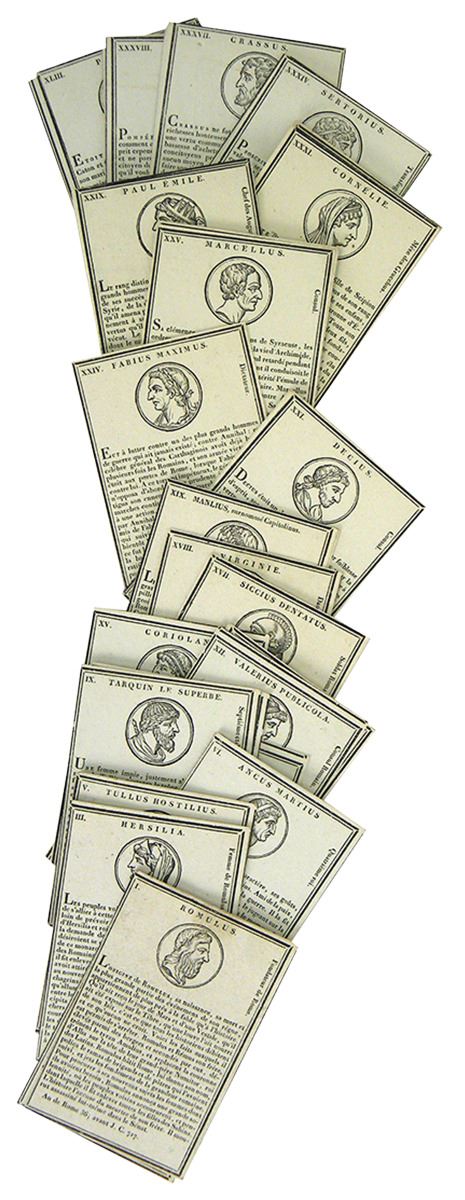 Jouy, Joseph Etienne. JEU DE CARTES HISTORIQUES. HISTOIRE ROMAINE. Lille & Paris, (1804). Deck of playing cards numbered 1-48 housed with 4-page Avis et Régles in original printed box. Cards depict Roman personages from Romulus to Augustus, with capsule biographies of each. First issue [103 by 68 mm]. Complete, with intact box. Very good or better. A remarkable set of playing cards designed by Joseph Etienne Jouy and published in 1804 as an instructional aid. An incomplete set sold in last year's New York sale for $1300 hammer.
