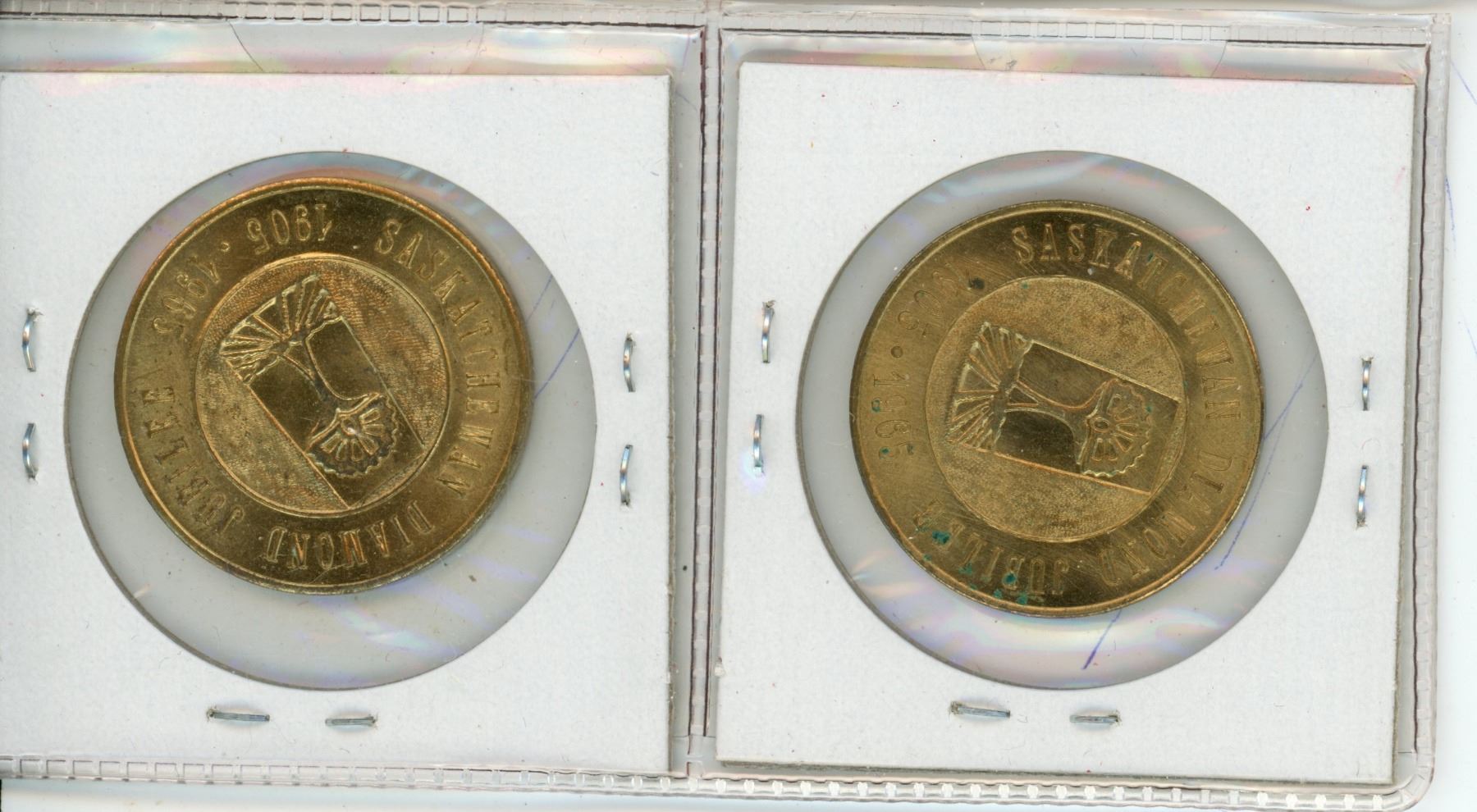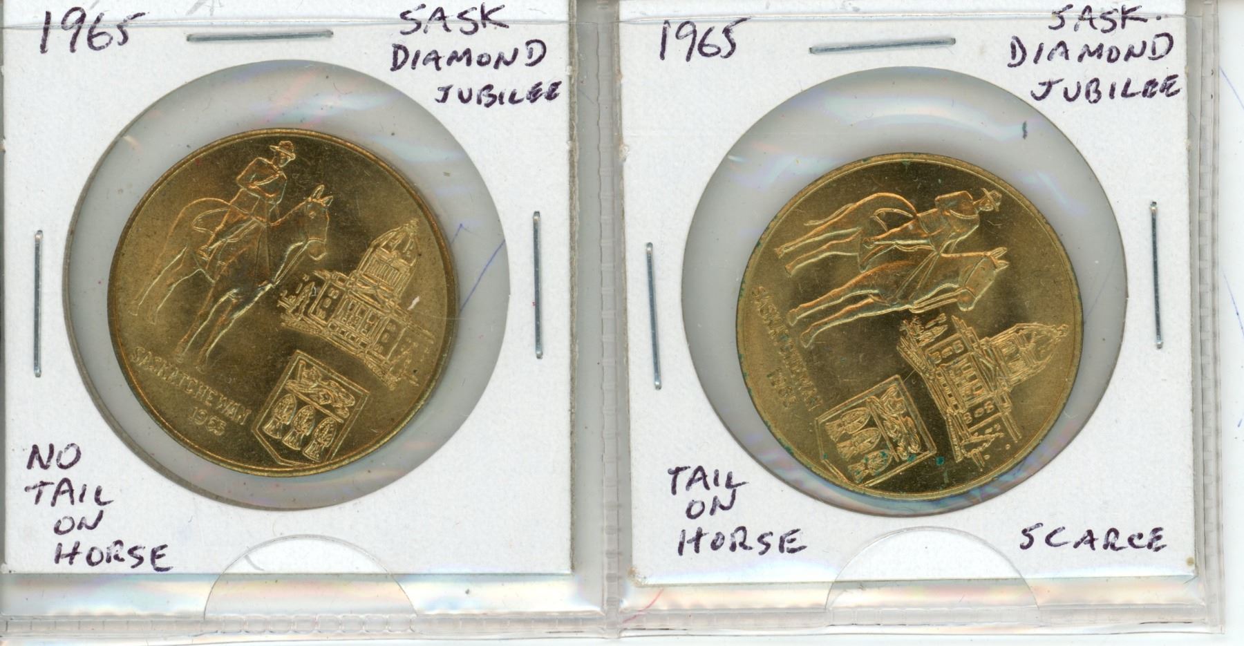 Complete Set of 2 1965 Saskatchewan Diamond Jubilee Brass Medals. Includes Horse no Tail, Plus Scarce Tail on Horse and Doubled Date and SASKATCHEWAN
