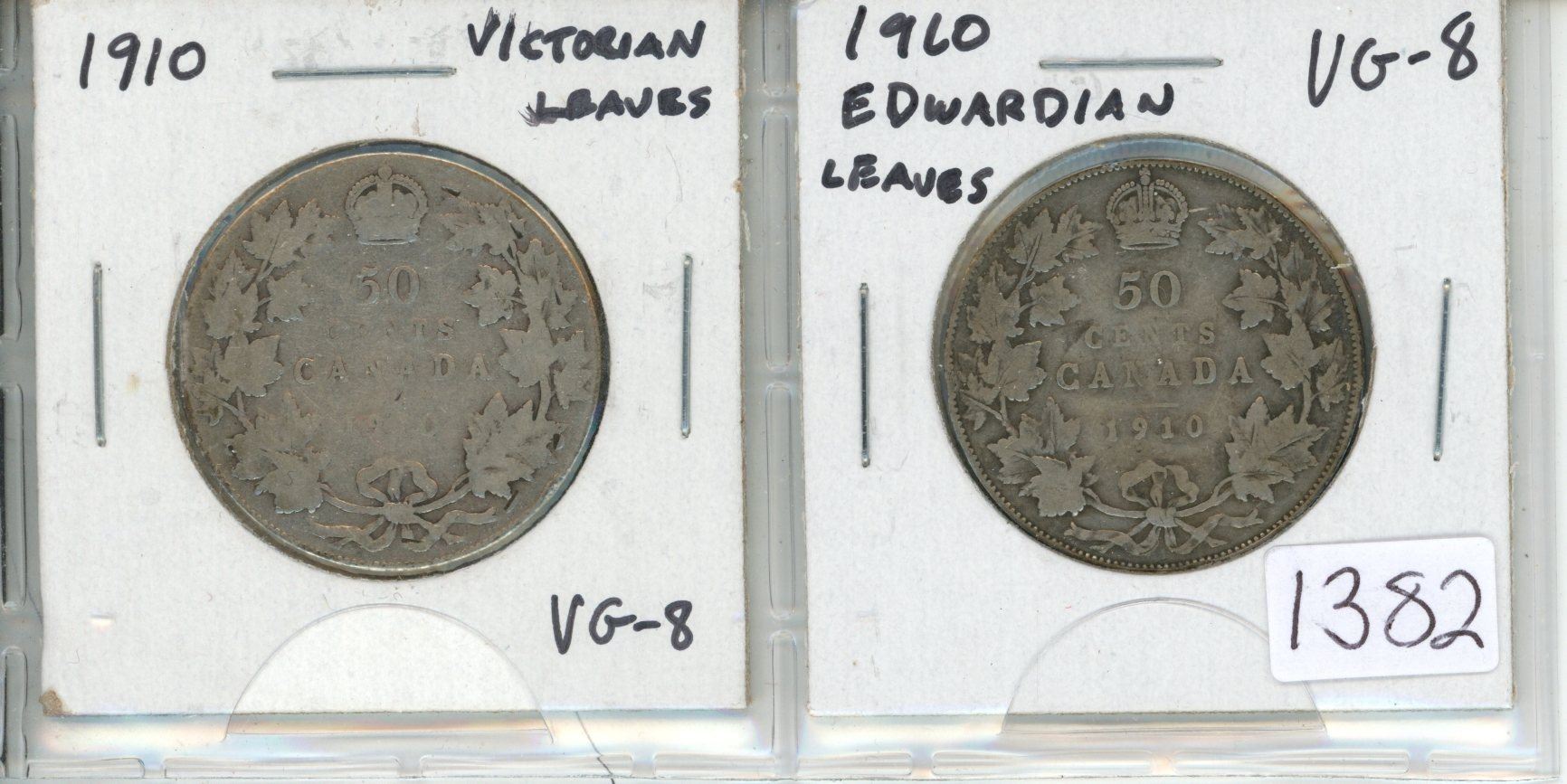 Complete Set of 2 Canadian Edward VII Silver 50 Cents. Includes Scarce Victorian Leaves and more common Edwardian Leaves. Both coins grade VG-8.