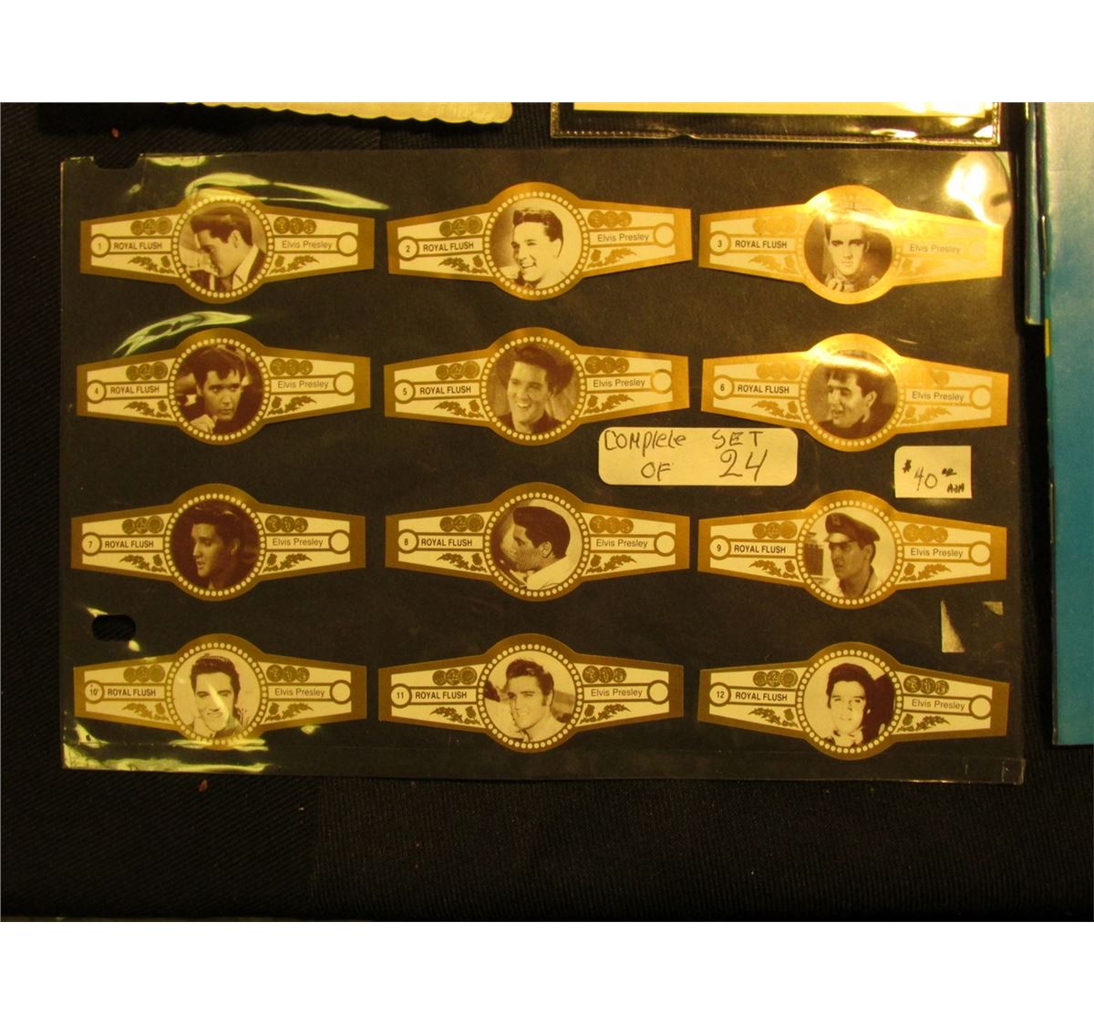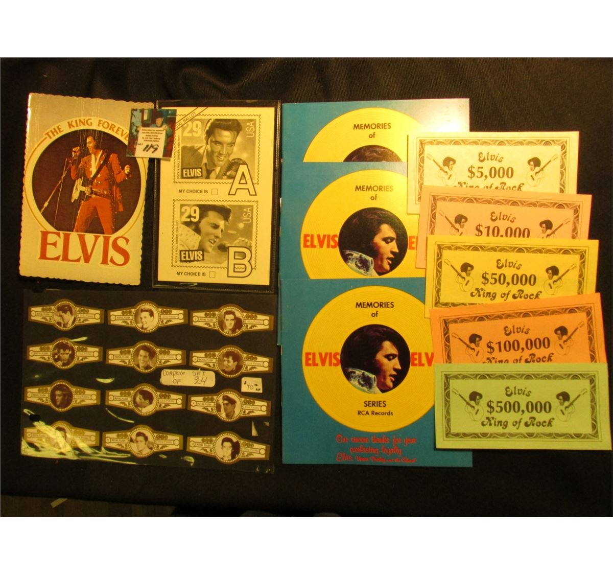 Complete Set of 24 "Royal Flush Elvis Presley" Cigar Bands; 1977 Elvis Presley Post Card; Set of Elvis (Presley) Currency $5,000, $10,000, $50,000, $100,000, & $500,000 notes; Elvis Post Card for ordering Stamps; & (3) "Memories of Elvis Series RCA Records" Promotion Photo Albums.
