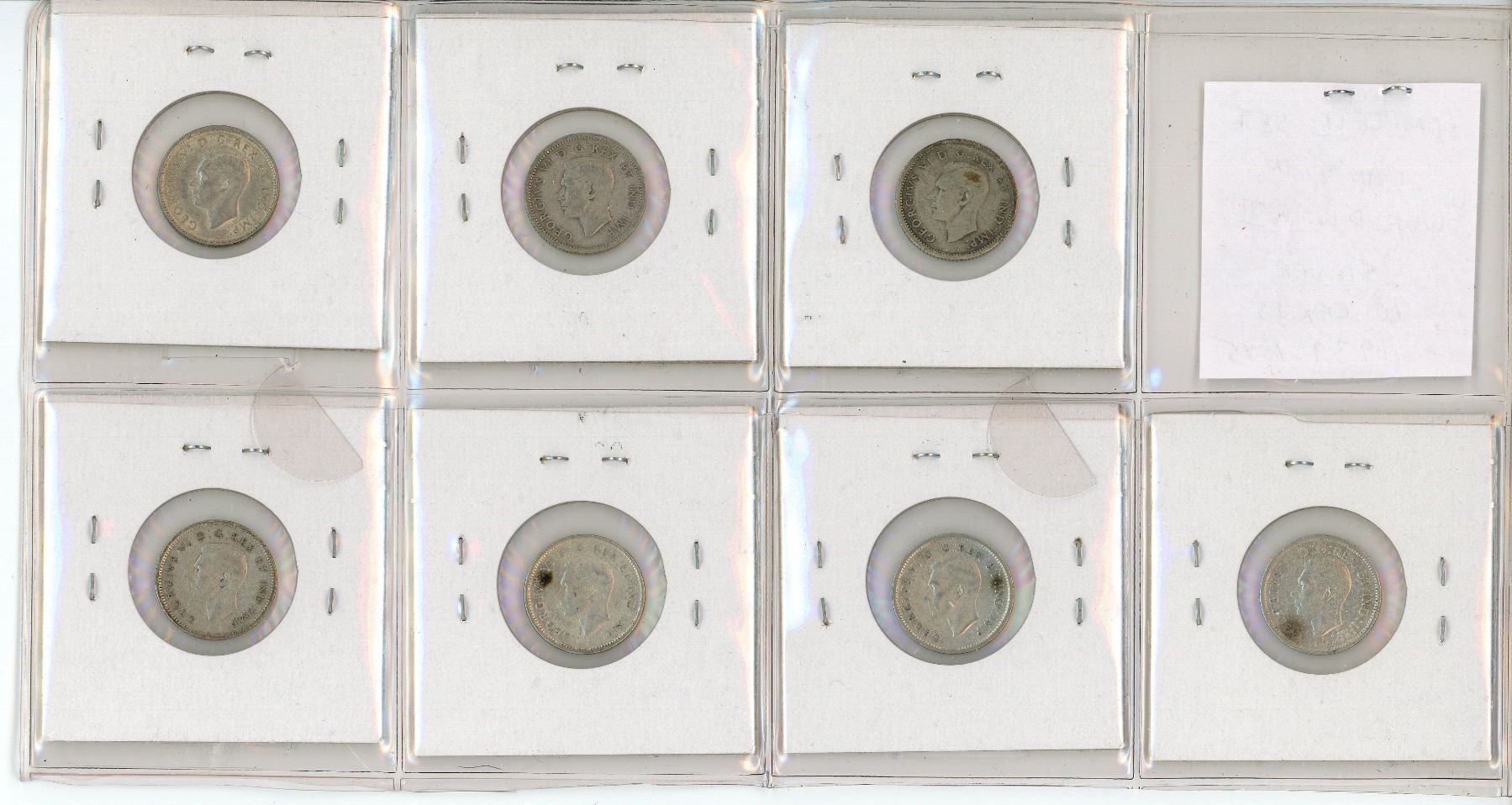 Complete Set of 7 Canadian World War II Silver 10 Cents dated 1939 to 1945. Coins grade VG-8 to VF-30.