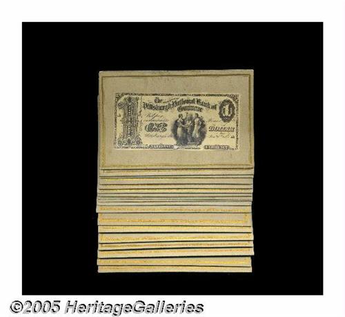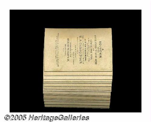 <B>Complete Set of Eighteen Different Naramore Counterfeit Detector Cards.</B></I> This is a complete collection of 18 Naramore cards, nine First Charter Nationals and nine Legal Tenders, that has been well preserved. The outlining gilt border is of superior quality than usually found, while very little scuffing is found on this magnificent set. An act of Congress and cooperation of the Treasury Department got R.C. Naramore the permission to photograph these notes at 25% of their original size in 1866. The government's consent was withdrawn shortly thereafter. This was the first time that United States paper money had been officially photographed for distribution to the public.<BR>