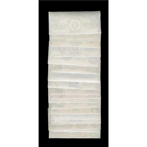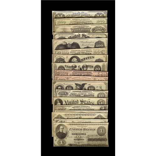 <B>Complete Set of Eighteen Different Naramore Counterfeit Detector Photos.</B></I><BR> This is a complete collection of 18 Naramore photos, nine First Charter Nationals and nine Legal Tenders, that has been well preserved. An act of Congress and cooperation of the Treasury Department got R.C. Naramore the permission to photograph these notes at 25% of their original size in 1866. The government's consent was withdrawn shortly thereafter. This was the first time that United States paper money had been officially photographed for distribution to the public. This group of eighteen photographs appears to have never been mounted to the cards that Naramore used to distribute his anti-counterfeiting sets. This set was found in the same album that brought us the stamp envelopes, the Superb $5 Educational, and the no-signatures Grant-Sherman face found elsewhere in this catalog. <BR><BR><b>Shipping:</b> Coins & Currency (<a target="_blank" href="http://www.heritageauctions.com/common/shipping.php">view shipping information</a>)