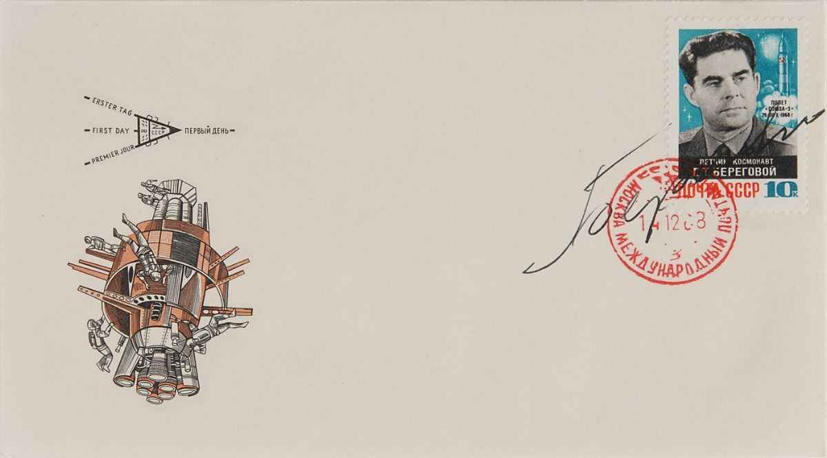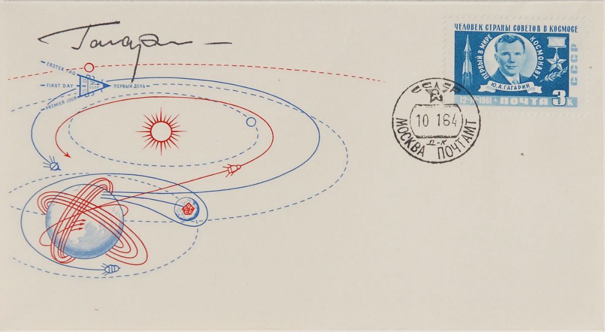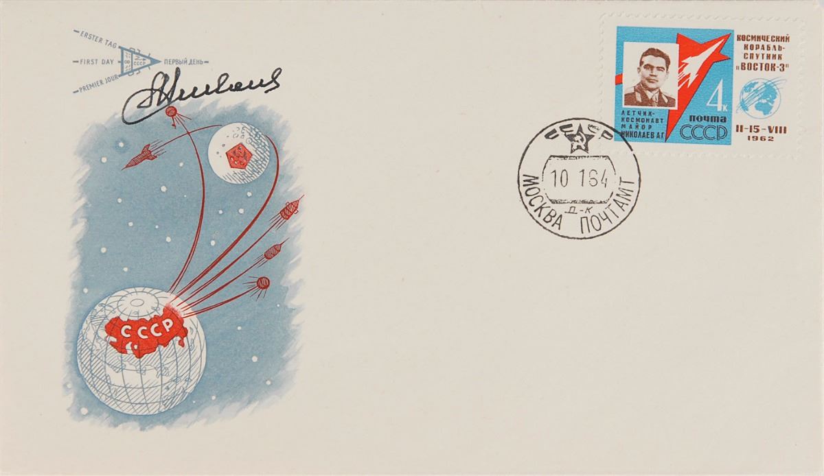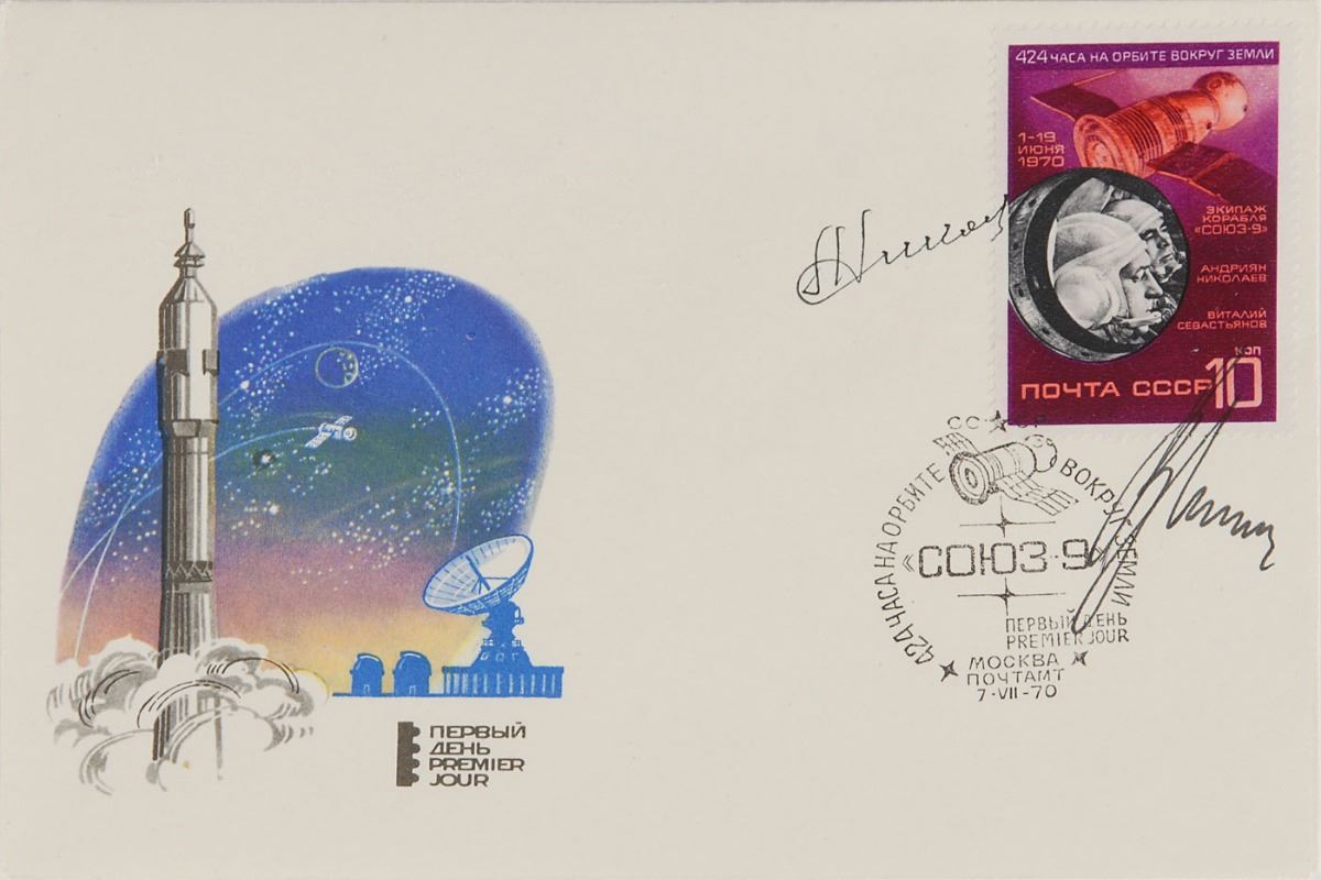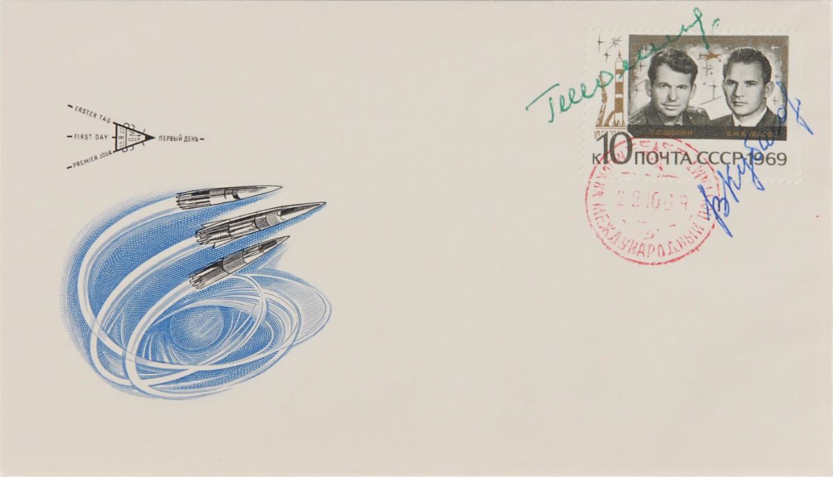 Set of fourteen KNIGA covers with cachets commemorating Russian space achievements, each signed in ink by at least one cosmonaut, including: Yuri Gagarin; Valentina Tereshkova; Valery Bykovsky; Pavel Popovich; Andriyan Nikolayev; Gherman Titov; Georgi Shonin and Valeri Kubasov; Anatoly Filipchenko, Vladislav Volkov, and Viktor Gorbatko; Vladimir Shatalov and Aleksei Yeliseyev; Yevgeny Khrunov, Vladimir Shatalov, Aleksei Yeliseyev, and Boris Volynov; Georgy Beregovoy; Pavel Belyayev and Alexei Leonov; Vladimir Komarov, Konstantin Feoktistov, and Boris Yegorov; and Andriyan Nikolayev and Vitaly Sevastyanov. In overall fine condition.