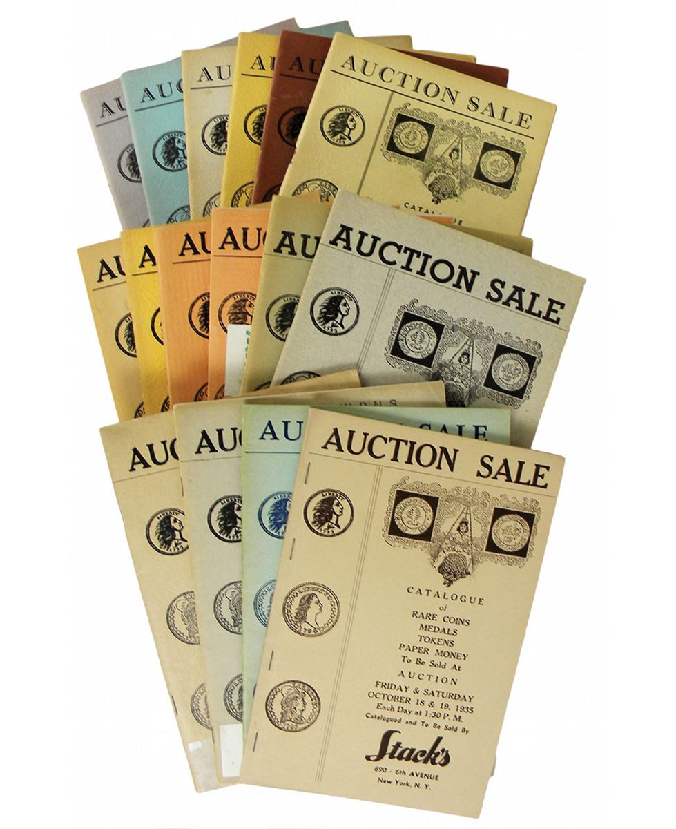 Stack's. AUCTION SALE CATALOGUES. New York, 1935-2005. An essentially complete run of over 500 catalogues. Lacking only three recent sales dated Oct. 1, 1999, Oct. 13, 2004 and Nov. 17, 2004. It is otherwise complete through the end of 2005, and includes several Ford sales beyond that date. [...] Many of the sales present feature the original prices realized lists, with earlier sales being more likely to lack these and sales since the 1960s mostly including them. The set derives from the nearly complete set assembled by Del Bland, which has been enhanced by the present consignor. [...] Some catalogues appear to be from the library to Ray Williamson. Various formats, all in the original printed or pictorial card covers. Generally fine. [Online description truncated; see PDF or printed catalogue for full description.]
