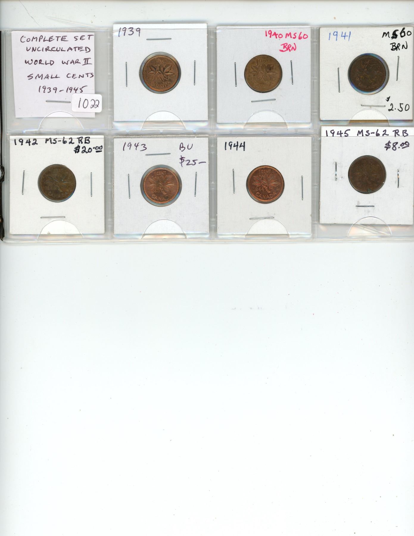 Complete Set of Uncirculated Canadian World War II Small Cents. Includes 1939, 1940, 1941, 1942, 194
