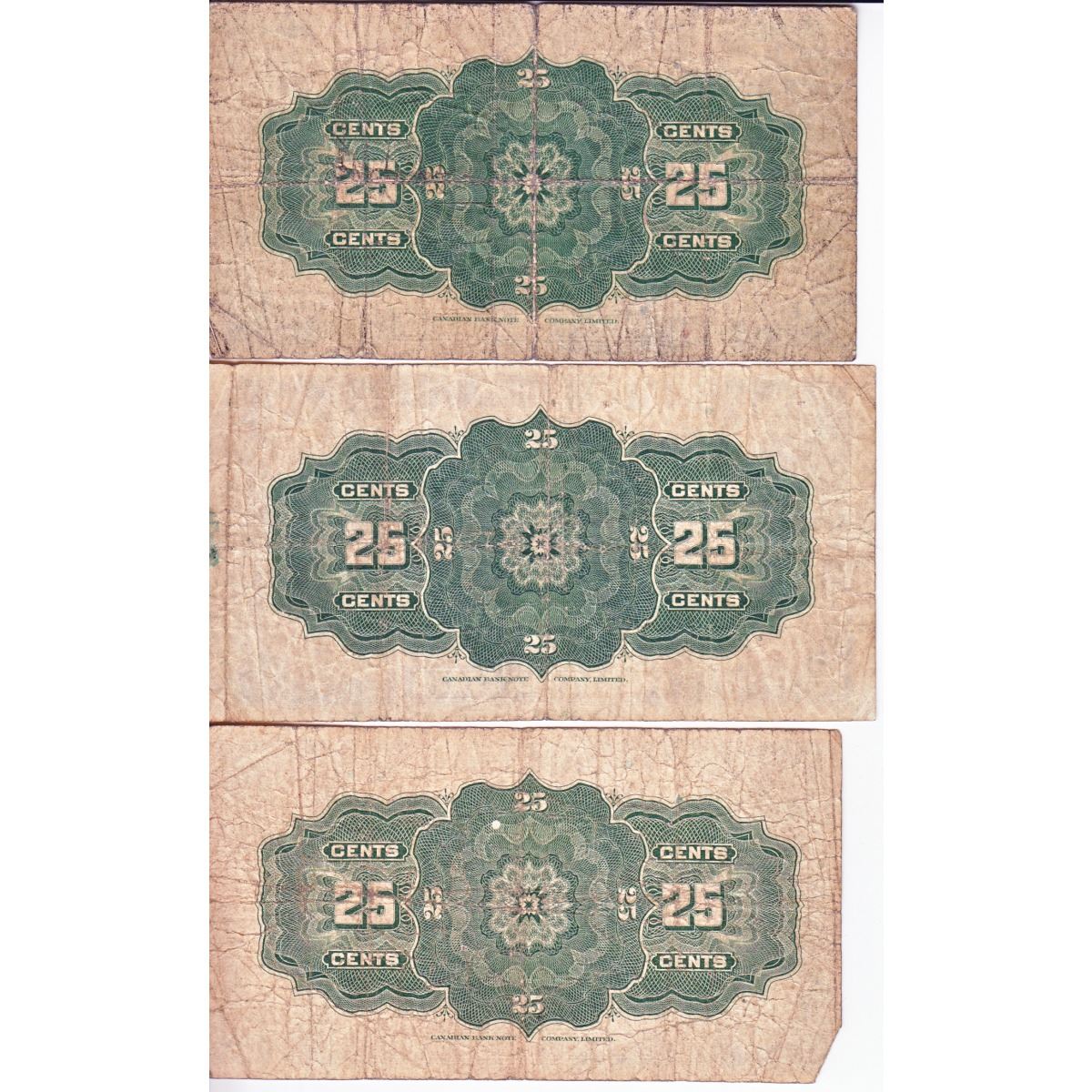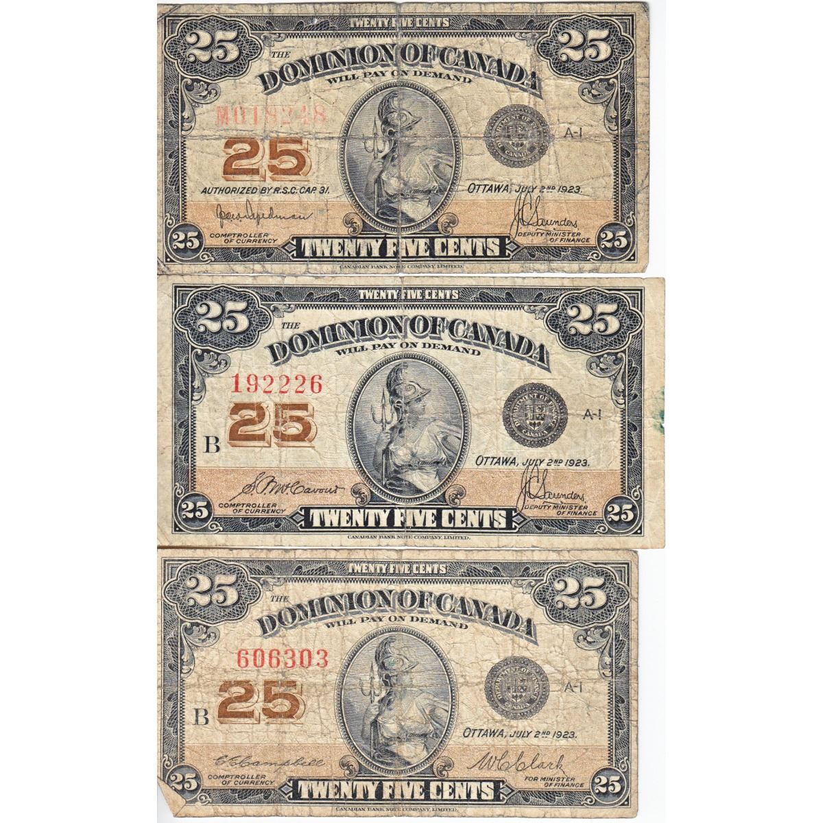 Complete Signature Type Set of the 1923 25c Note from the Dominion of Canada. Lot includes 3 Notes; one of each Signature Combination available in the Series. Notes are in VG or Better Condition Buyers Premium will be added on all items as per our terms of sale. We accept Paypal, Credit Card, E-Transfer Payments, Cheque or Money Orders (there is an additional 3% fee for using Paypal or Credit Card). All invoices will be emailed immediately following the auction, please contact us if you would like to pay by credit card or receive a new revised lower total for mailing in payment or sending an e-transfer (3% discount). All Items Are Sold "AS IS", no returns