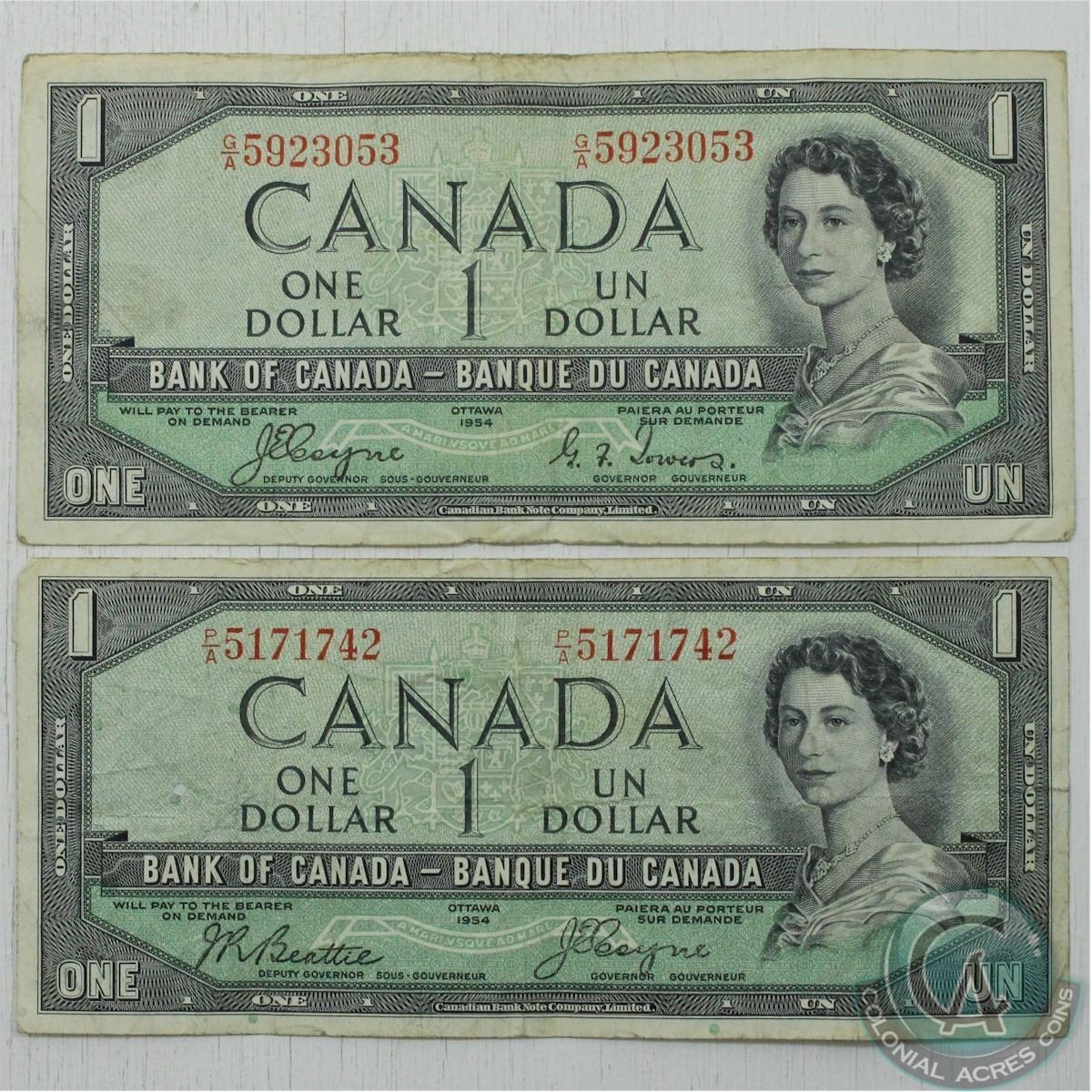 Complete Signature Type Set of the 1954 Devil's Face $1 Canada Series. Included are two 1954 Devil's Face $1.00 Notes, one of each signature combination available in the Series.