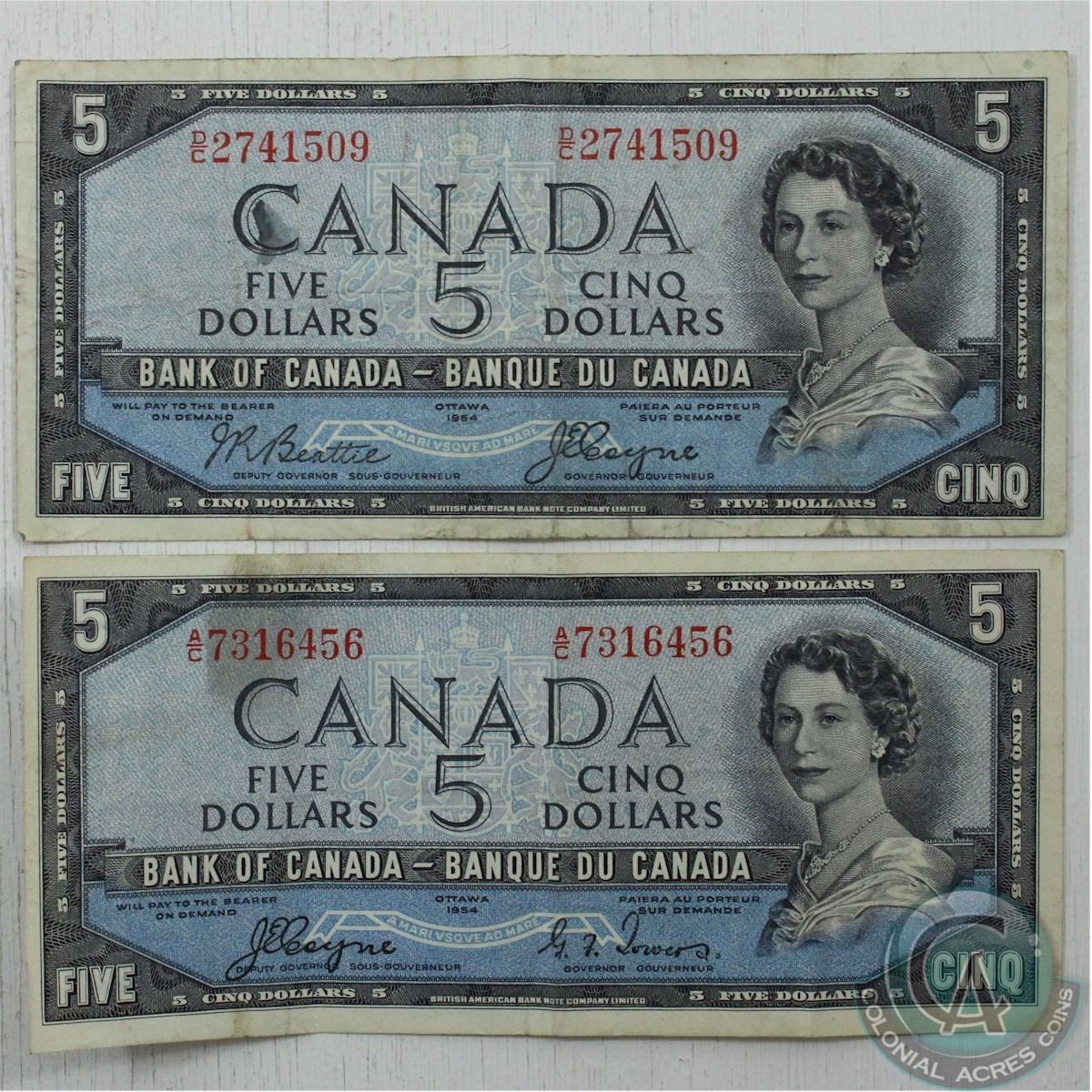 Complete Signature Type Set of the 1954 Devil's Face $5 Canada Series. Included are two 1954 Devil's Face $5.00 Notes, one of each signature combination available in the Series.