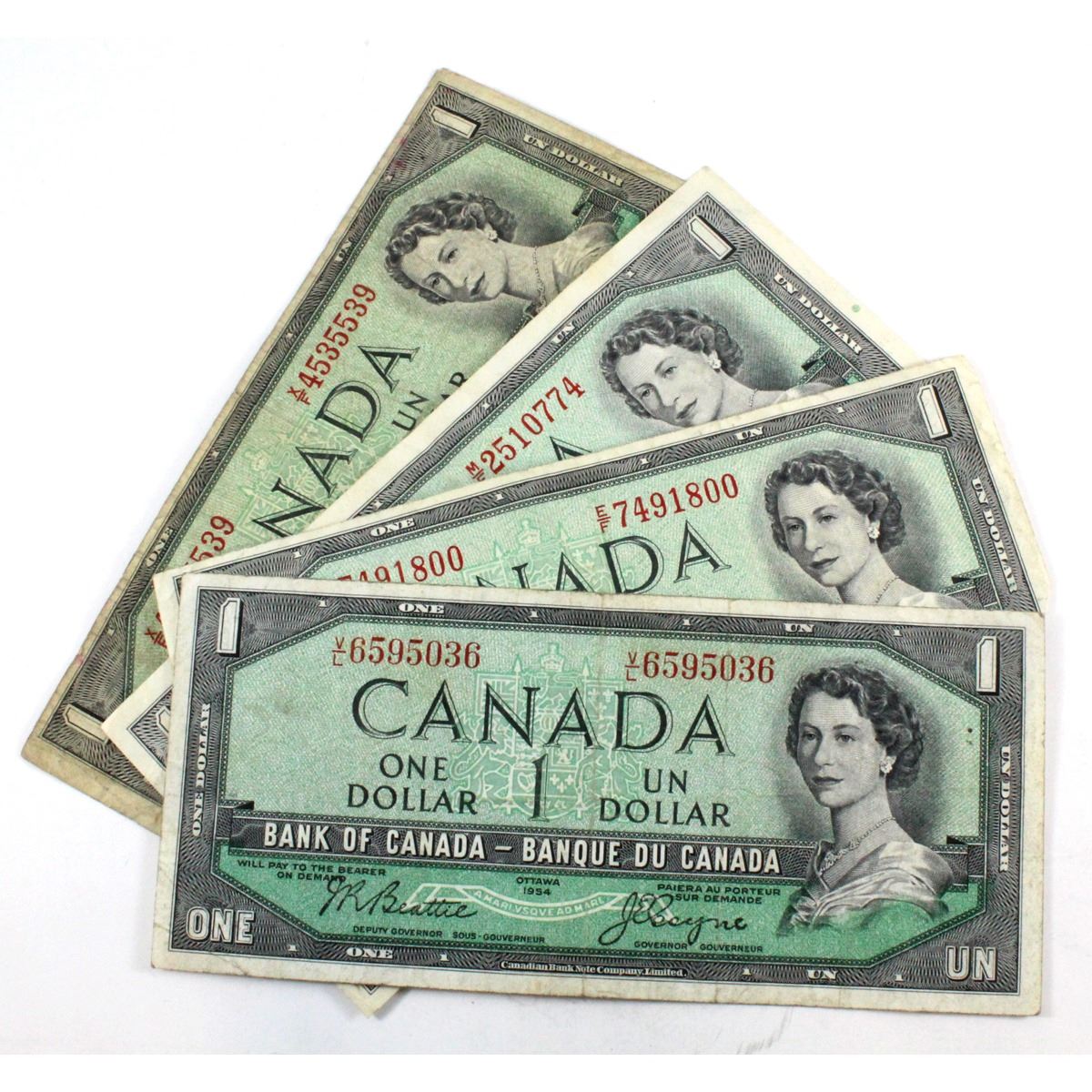 Complete Signature Type Set of the 1954 Modified Portrait $1.00. Includes 4 Notes; one from each Signature Combination available in the Series. Buyers Premium will be added on all items as per our terms of sale. We accept Paypal, Credit Card, E-Transfer Payments, Cheque or Money Orders (there is an additional 3% fee for using Paypal or Credit Card). All invoices will be emailed immediately following the auction, please contact us if you would like to pay by credit card or receive a new revised lower total for mailing in payment or sending an e-transfer (3% discount). All Items Are Sold "AS IS", no returns