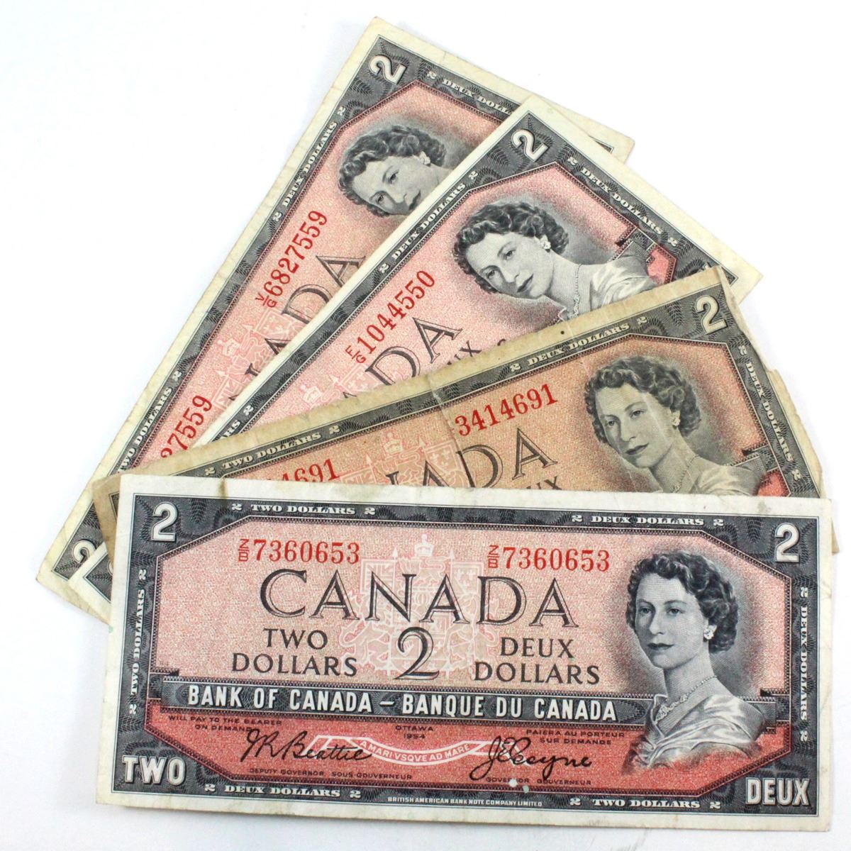 Complete Signature Type Set of the 1954 Modified Portrait $2.00. Lot included 4 Notes, one from each Signature Combination available in the Series. Buyers Premium will be added on all items as per our terms of sale. We accept Paypal, Credit Card, E-Transfer Payments, Cheque or Money Orders (there is an additional 3% fee for using Paypal or Credit Card). All invoices will be emailed immediately following the auction, please contact us if you would like to pay by credit card or receive a new revised lower total for mailing in payment or sending an e-transfer (3% discount). All Items Are Sold "AS IS", no returns