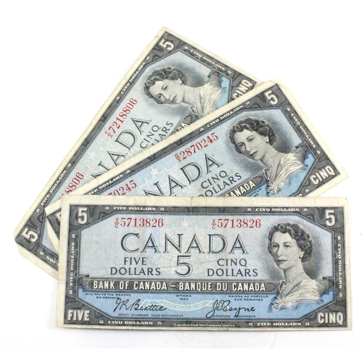 Complete Signature Type Set of the 1954 Modified Portrait $5.00. Lot includes 3 Notes, one from each Signature Combination available in the Series. Buyers Premium will be added on all items as per our terms of sale. We accept Paypal, Credit Card, E-Transfer Payments, Cheque or Money Orders (there is an additional 3% fee for using Paypal or Credit Card). All invoices will be emailed immediately following the auction, please contact us if you would like to pay by credit card or receive a new revised lower total for mailing in payment or sending an e-transfer (3% discount). All Items Are Sold "AS IS", no returns