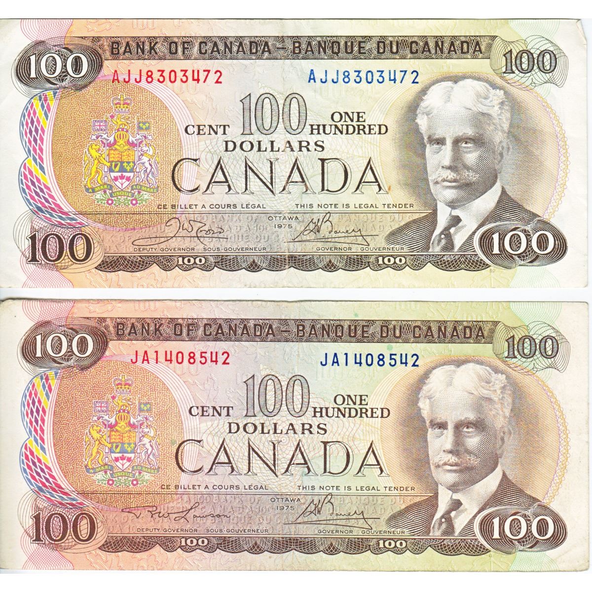 Complete Signature Type Set of the 1975 $100.00 Series. Lot includes two $100.00 Notes; one of each Signature Combination available in the Series. Buyers Premium will be added on all items as per our terms of sale. We accept Paypal, Credit Card, E-Transfer Payments, Cheque or Money Orders (there is an additional 3% fee for using Paypal or Credit Card). All invoices will be emailed immediately following the auction, please contact us if you would like to pay by credit card or receive a new revised lower total for mailing in payment or sending an e-transfer (3% discount). All Items Are Sold "AS IS", no returns