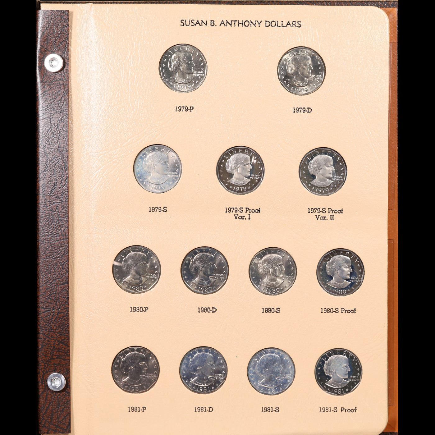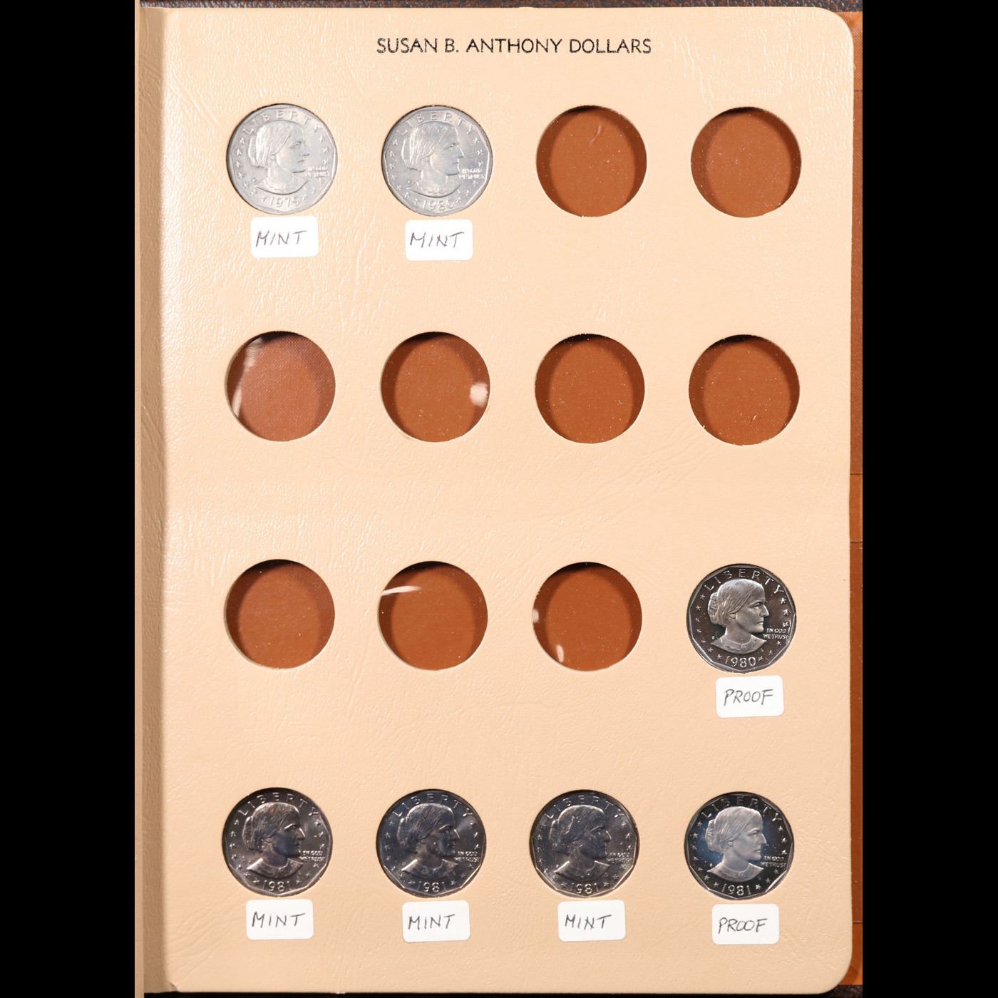 Complete Susan B. Anthyony $1 Dansco book, 1979-1981, 13 coins including 4 proofs, with 7 extra coin