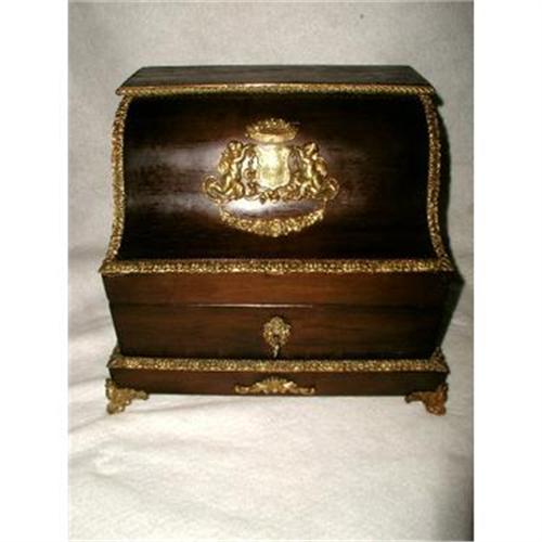 Magnificent walnut and bronze complete tantalus from England C.1850. Outlined with ornate bronze and a center display of shield and crown surrounded by two cherubs who are repeated on the escutcheon with working lock and key. Bronze feet and handles as well. The rich wood top folds back to reveal three crystal weighted decanters,two cut work design,the other plain,all have matching round multi facet cut stoppers. Six 4 ox. weighted glasses,black and gold starburst design,complete the set. A fabulous addition to any man's bar. Excellent condition. Measures 13L X 11H X 10D.