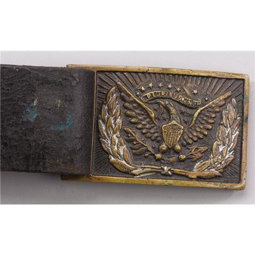 <B>Complete Union Sword Belt Rig.</B></I> A wonderful intact piece of Federal equipment anchored by a Model 1851 brass sword belt plate with keeper and adjuster. Attached to the belt are two leather sword hangers, 19.5” and 11” respectively, each having two large brass rivets and secured to the belt by brass rings. A fine holster and cap box complete the rig. The flap of the cap box carries two oval stamps: “E. A. Crossman & Co. Newark N.J.” and “J. C. Miller U. S. Ord Dept Sub Inspector”. Given the riveting present, there is no doubt that all elements of this rig are original to one another and have been together since the Civil War. The leather is crazed and somewhat worn along its extremities, however remains supple. All brass fixtures enjoy mellow old toning. Remnants of silver paint are to be seen in the recesses of the wreath on the belt plate. Overall fine condition. <BR><BR><b>Shipping:</b> Miscellaneous Collectibles, Smal (<a target="_blank" href="http://www.heritageauctions.com/common/shipping.php">view shipping information</a>) <BR><BR><B>Important notice:<