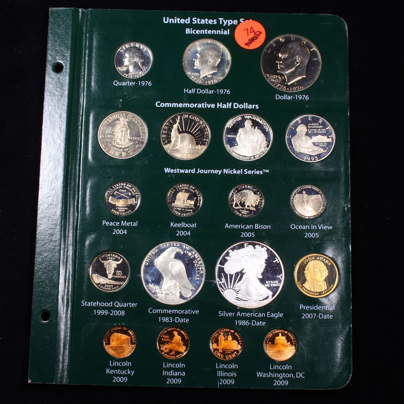 Complete United States Proof Type Set Page 1976-2009 19 coins. A excellent Complete United States Proof Type Set Page. Dates Included range from 1976-2009. An Excellent grouping of 19 coins. Includes all 4 proof 2009 Lincolns, a Proof Silver Eagle, a Proof Silver Olympic Commertaive Dollar, All 4 Westward Journey proof Nickels, 4 Proof Commertaive Half's Including the only 2 Silver, All 3 Proof Bicentennial Issues Quarter Half And Dollar