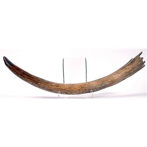 <Our item number 139053><B>Woolly Mammoth Tusk.</B> Complete tusks from a woolly mammoth Mammuthis primigenius are rare. This complete 22 inch long 1.5 inch diameter tusk is from a juvenile Mammoth that was most likely a male because of its size. It has been polished to reveal various shades of brown with patches of cream colored ivory. These colors resulted from the original white ivory being mineralized over thousands of years by minerals such as vivianite and iron phosphate. This museum quality tusk was found in the Taymyr Peninsula of Siberia and is between 30,000 and 100,000 years old. Most recovered Mammoth ivory is found in broken pieces unlike this exceptional specimen which comes with its own display stand.<BR><BR>Add $40.00 for domestic shipping. <BR>Estimated Value $1,300 - 1,600. <BR><BR>Our item number 139053<BR><IMAGES><P ALIGN="CENTER"><IMG SRC="http://www.goldbergcoins.net/liveauction/49jpegs/139053.jpg"> </P></IMAGES>
