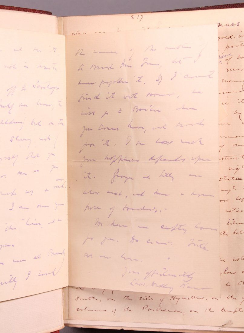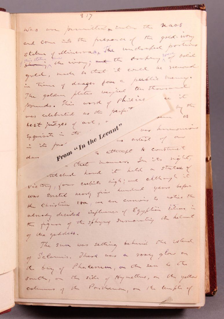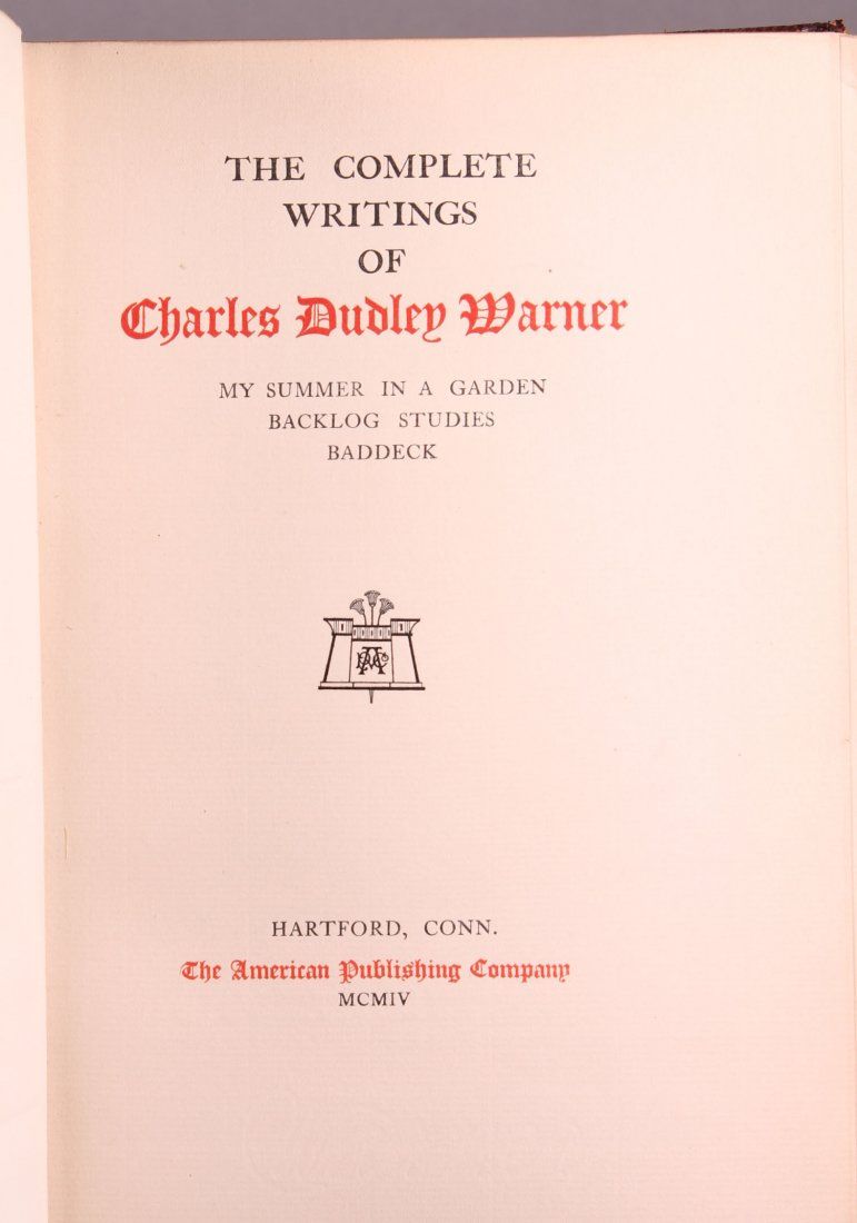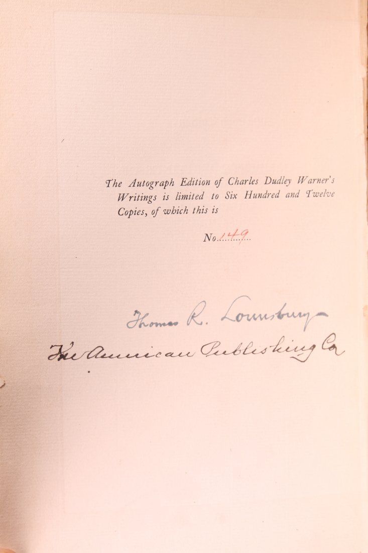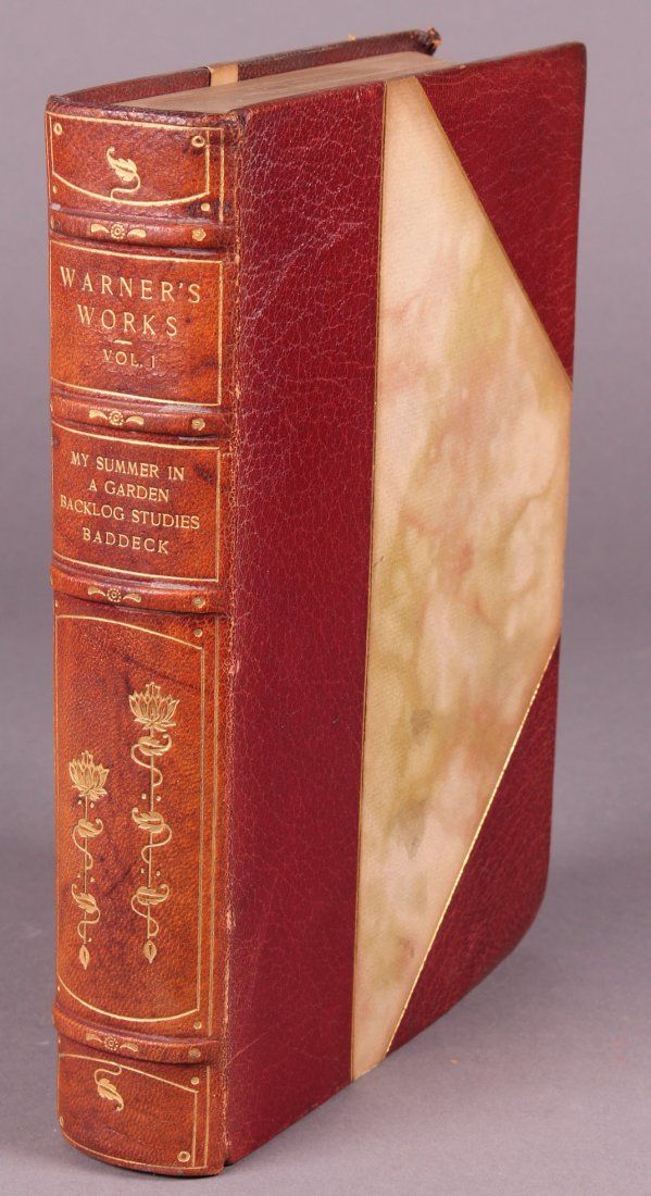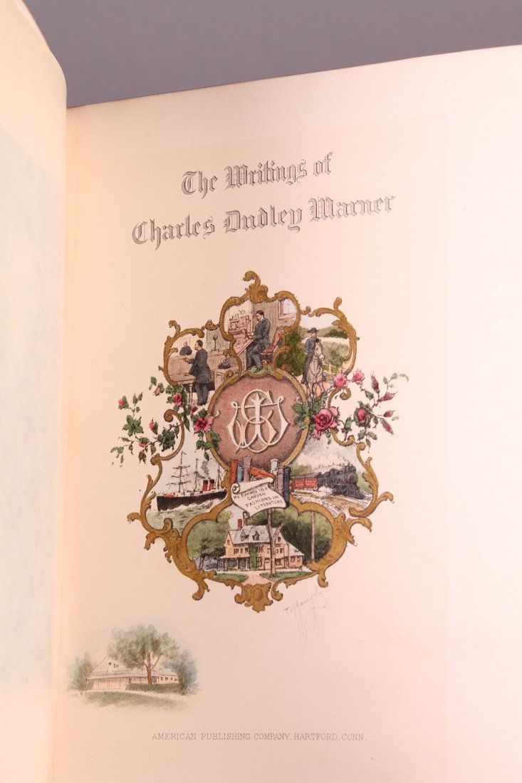 [History/Biography/Essays/Literature]. THE COMPLETE WRITINGS OF CHARLES DUDLEY WARNER. 15 Vols. Hartford, CT: American Publishing, 1904. 8vo. Contemp red morocco with floral decorations on lower portions of spines, marbled eps, teg. Illustrated with numerous mounted plates, mostly photogravures of art. Some frontises appear in 2 states. 9 frontises are pencil signed by the artist. One of 612. Autograph edition. Tipped in following Vol I?s series title leaf are: [1] Page 817 of Warner?s manuscript for ?In the Levant.? [2] 1] An ALS, dated ?Sept 5 1894,? signed ?Christopher Warner."
