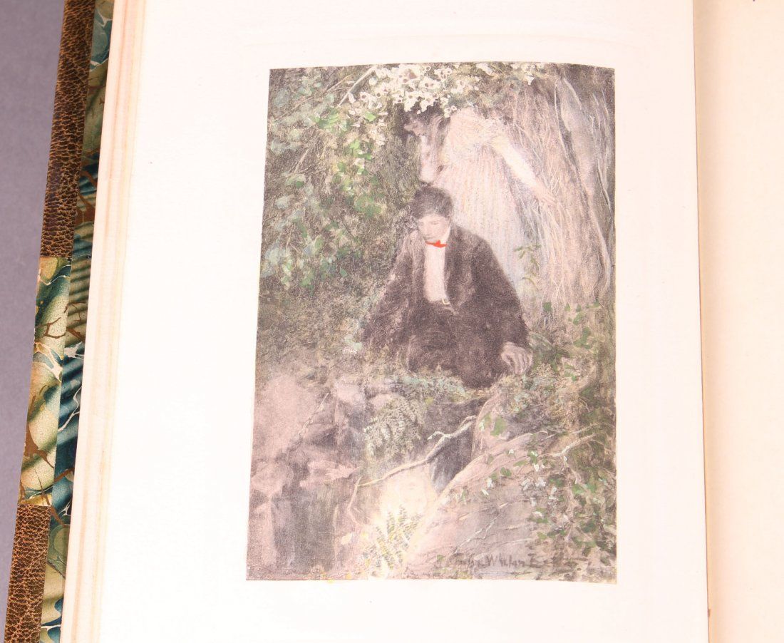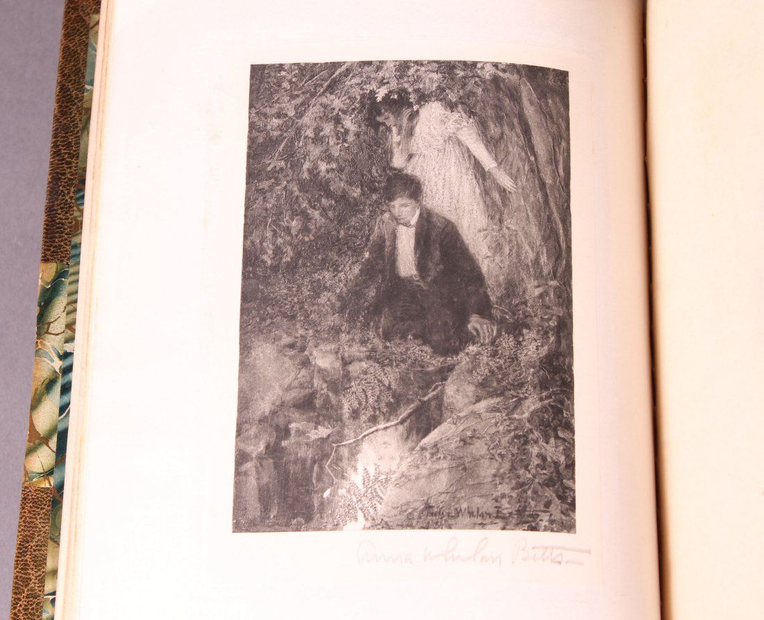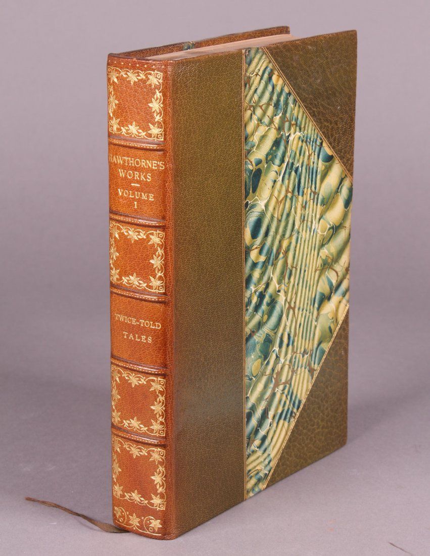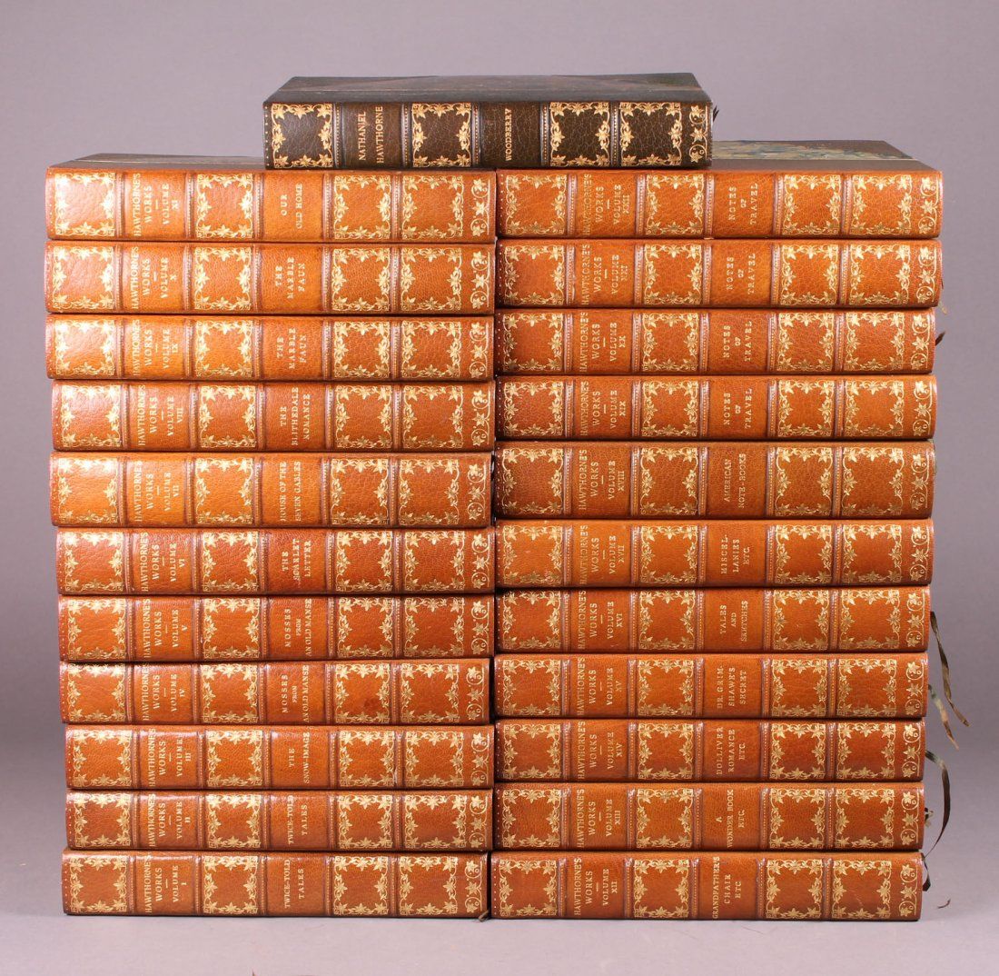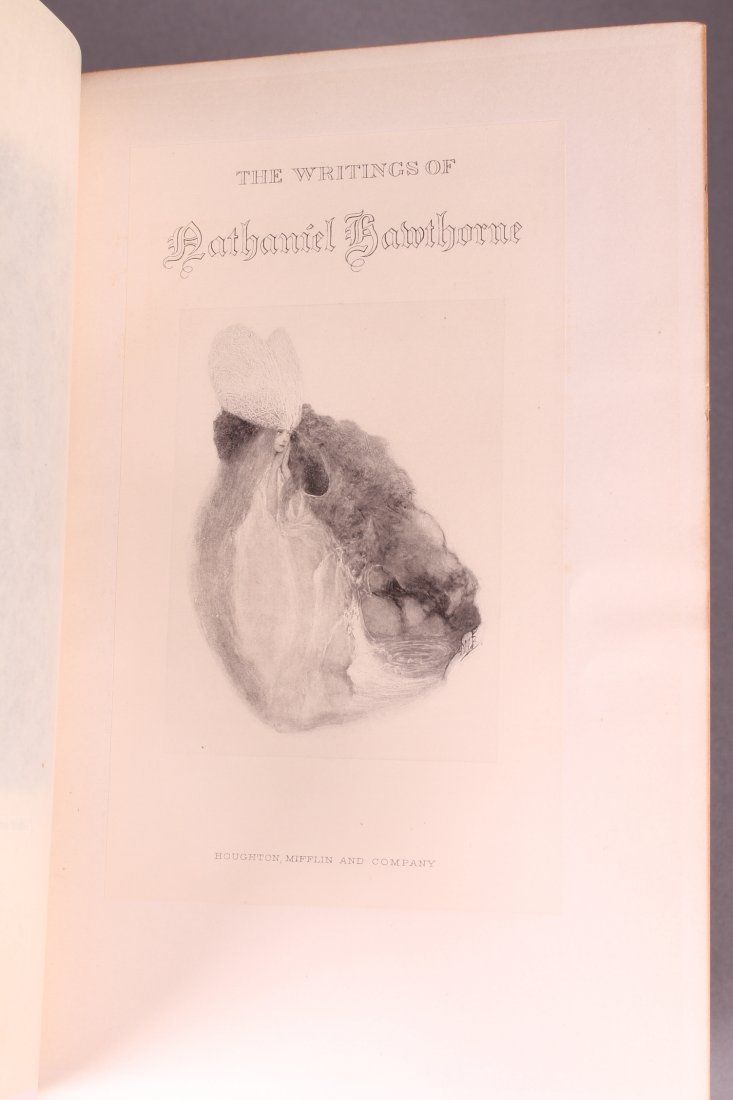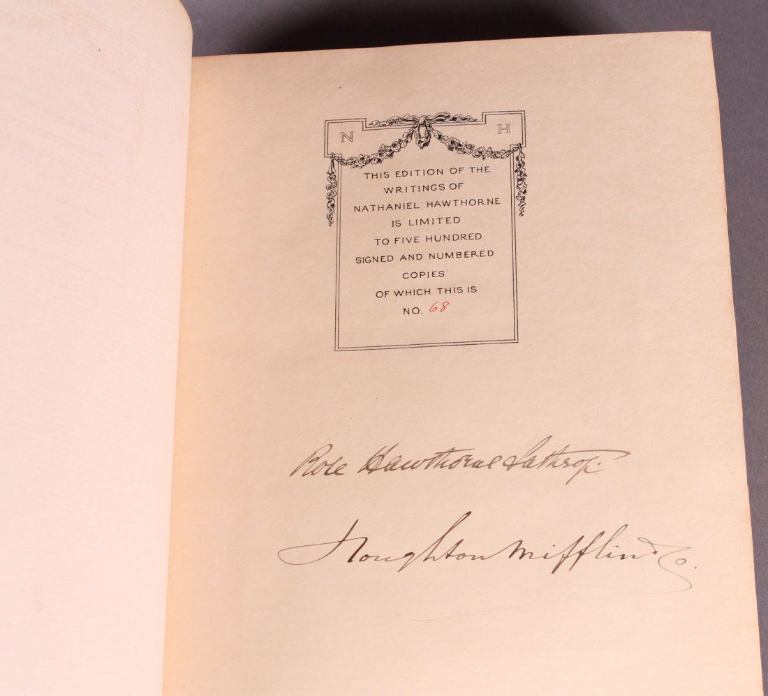 [Hawthorne, Nathaniel]. THE COMPLETE WRITINGS OF NATHANIEL HAWTHORNE. (Title is from printed series titles. Title as it appears on India Proof titles: THE WRITINGS OF NATHANIEL HAWTHORNE.) 23 Vols, including biography by George E. Woodbury. Bos: Houghton, Mifflin and Company, 1900-1901, biography 1902. 8vo. Later half green morocco and marbled board, marbled eps, teg, fore and tail edges uncut. First 22 volumes? frontises are in 2 states: Color and b/w, the latter signed by its artist. Artists? signatures include Anna Whelan Betts, Emlen M?Connell, Sarah S. Stilwell, Jessie Wilcox Smith (Vol IV), Mary Ayer, Eric Pape, Maude Cowles, B. West Clinedinst, Alice Barber Stephens (Vols IX-X), E. C. Pinxotto, Frank T. Merrill, Howard Pyle, A. I. Keller, Frederick McCormick, F. C. Yohn, Albert Herter, Harry Fenn, Childe Hassam (Vol XIX), Edmund F. Garrett (Vol XX), Jules Guerin (Vol XXI), and Ross Turner. Except for the color state of the frontises, the 2 facsimile documents (in Vol XVII), and the biography?s frontis, all the plates are mounted. Total of 161 plates (including the 22 vignette series titles, each of 2 states of the 22 frontises, and the biography?s single frontis). Autograph Edition, #68 of 500 signed by Rose Hawthorne Lathrop on Vol I?s limitation leaf. BAL 7645.